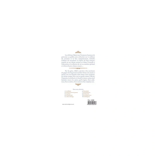 Perfectionnez votre comportement islamique avec notre collection de livres sur l'éducation musulmane et les bonnes manières (Akhlaq). Découvrez les vertus prophétiques, les nobles caractères et les règles de bienséance selon l'exemple du Prophète ﷺ dont le comportement était le Coran. Ces ouvrages enseignent la purification de l'âme, les relations sociales islamiques et les moyens d'augmenter sa foi par les actes. Parfait pour cultiver la sincérité, la piété et devenir une prédication silencieuse de la beauté de l'Islam. Suivez les conseils des savants pour obtenir l'agrément d'Allah dans cette vie et l'au-delà.