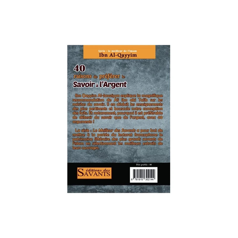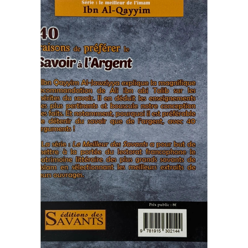 Dans cet ouvrage d’une rare profondeur, Ibn Qayyim Al-Jawziyya s’attarde sur une parole mémorable de l’illustre compagnon ‘Ali ibn Abî Tâlib, qui distingue avec finesse les mérites du savoir par rapport à la richesse. À travers une réflexion méthodique et inspirée, l’auteur développe quarante arguments démontrant pourquoi le savoir est bien plus noble et bénéfique que l’argent. Ces arguments, tirés du Coran, de la Sunna et de l’observation lucide du monde, viennent bousculer les idées reçues et orienter le cœur vers l’essentiel.