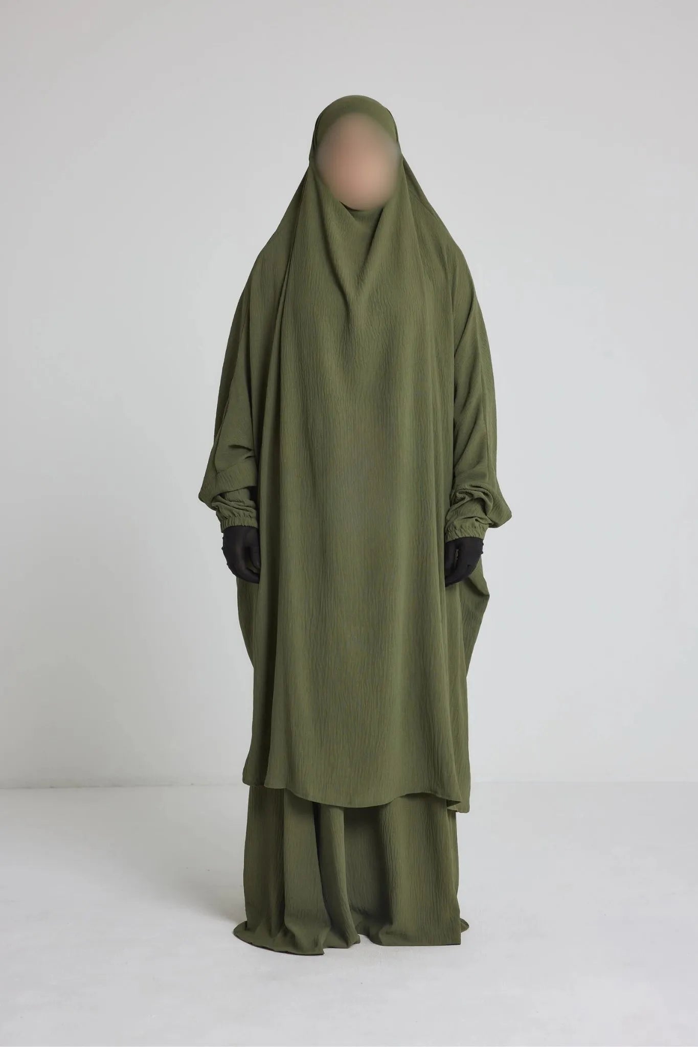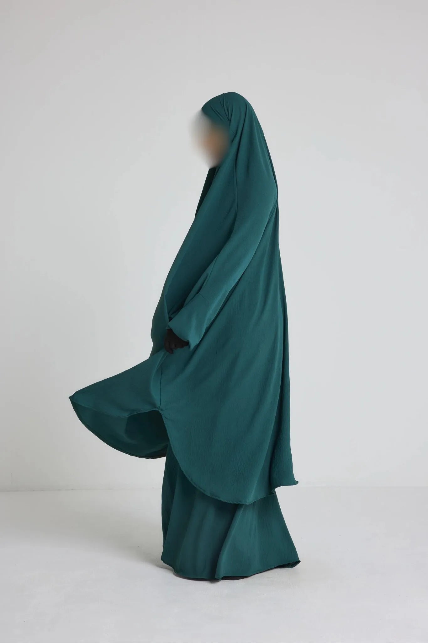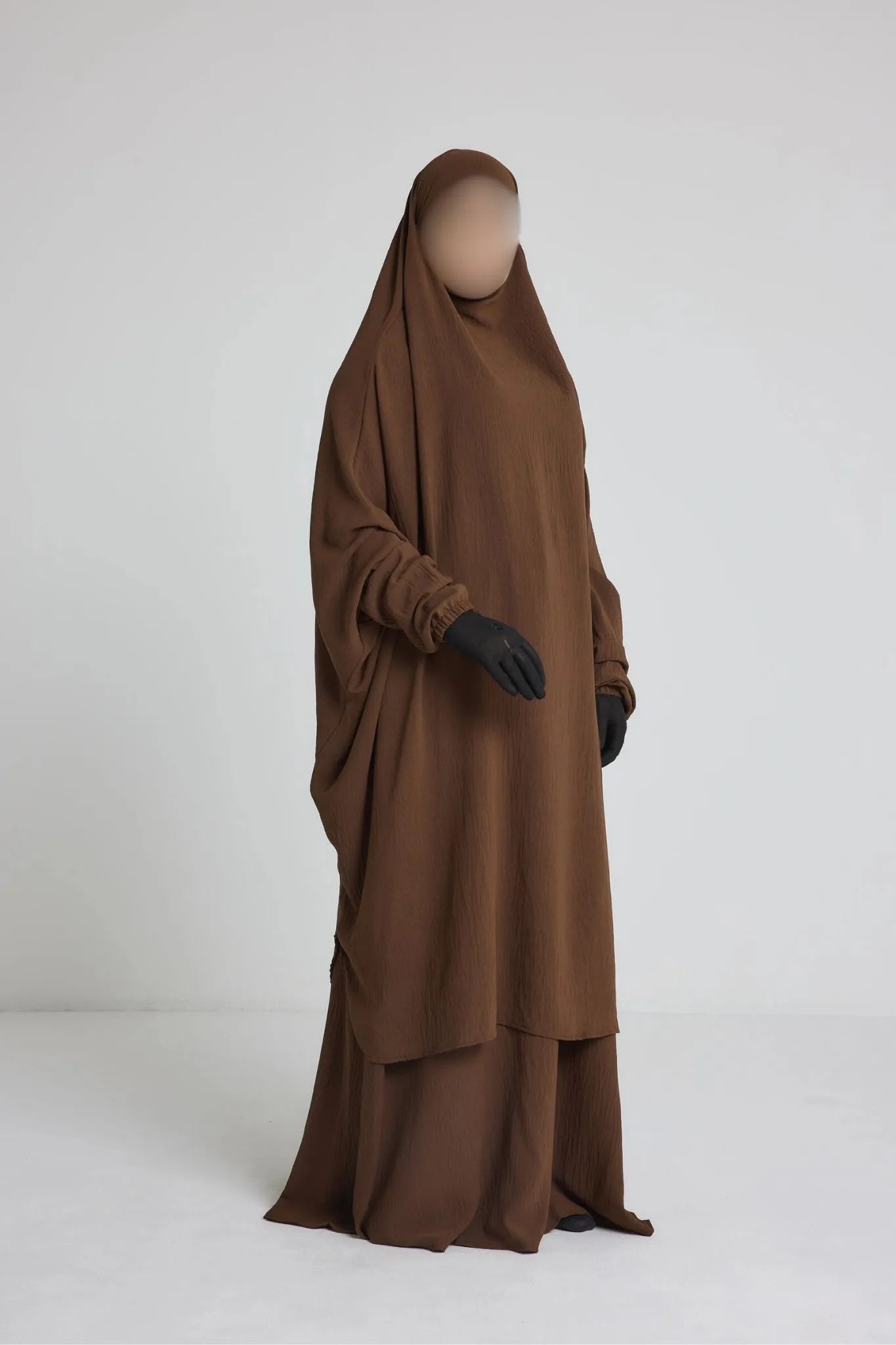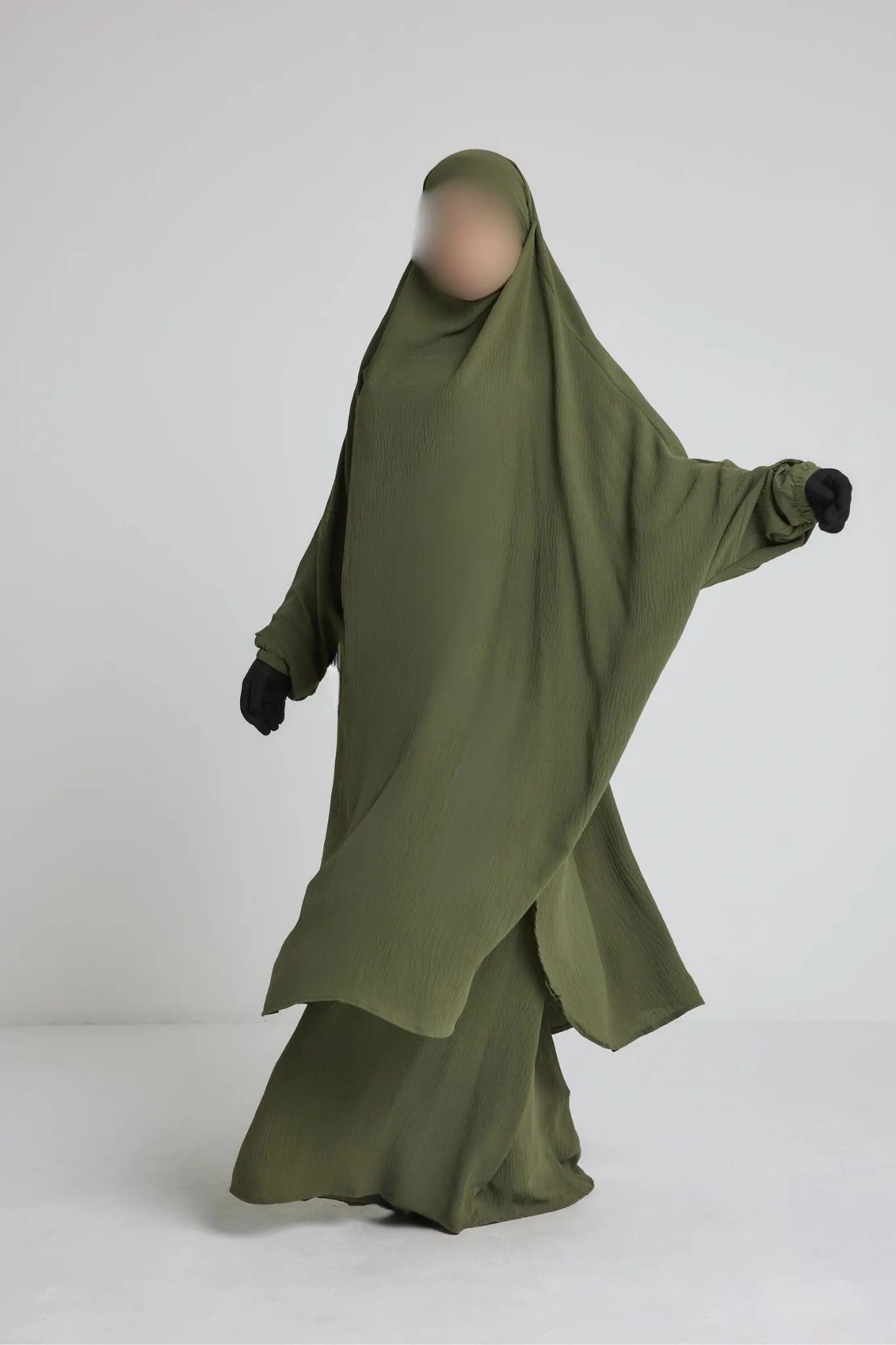 Composé d’un haut à capuche couvrant et d’une jupe longue assortie, cet ensemble jilbeb 2 pièces en jazz a été pensé pour allier pudeur, confort et praticité. Le tissu jazz, fluide et mat, est reconnu pour sa légèreté, son opacité naturelle et son tombé élégant qui ne colle pas au corps. Il offre un port agréable, même en été ou lors de longues journées en extérieur.
