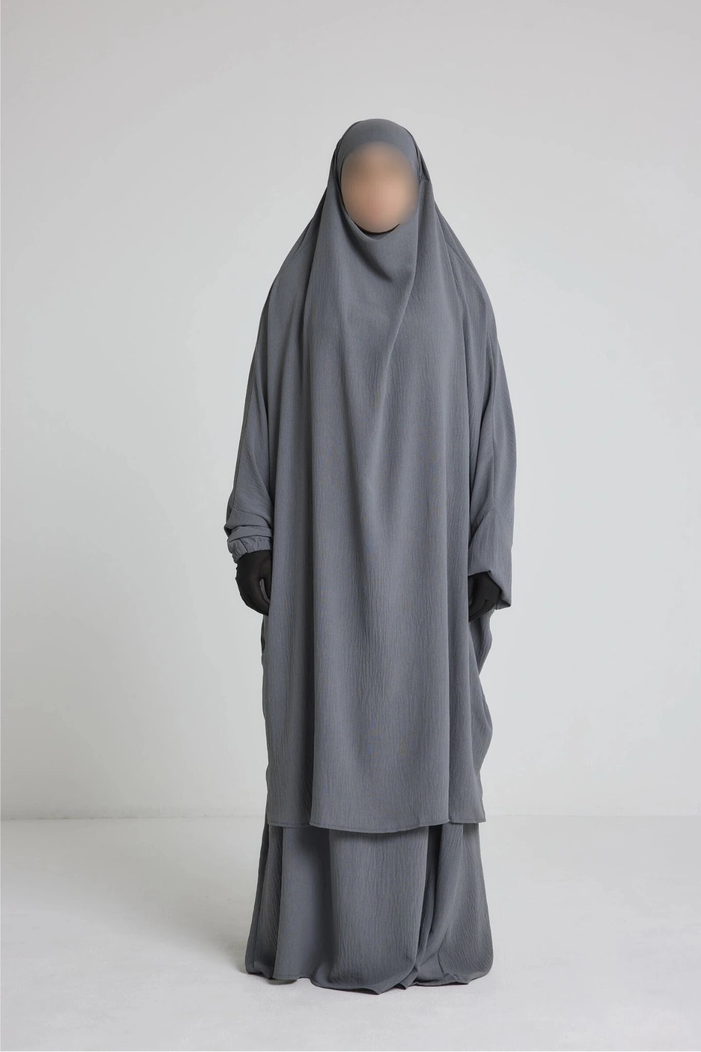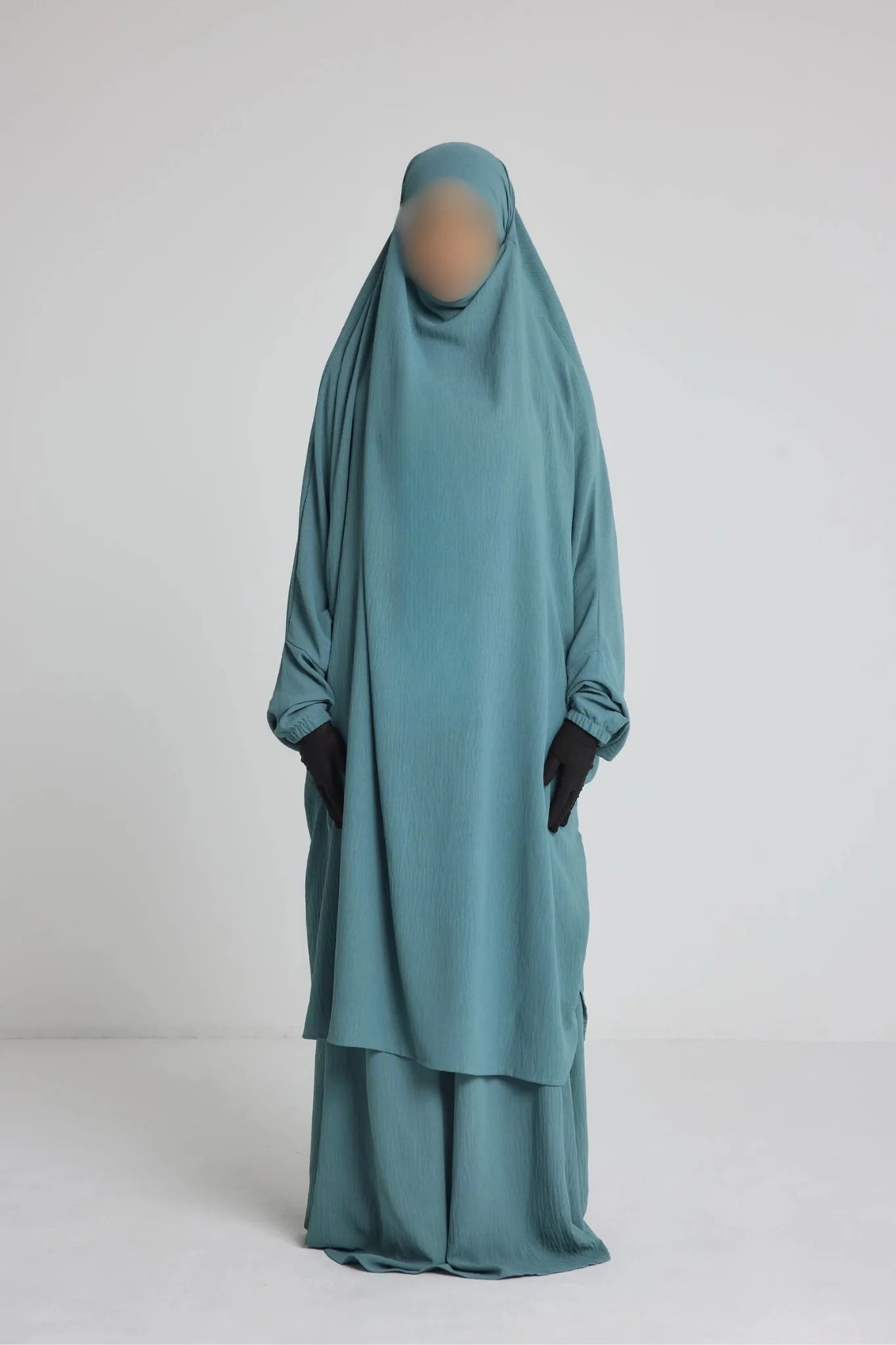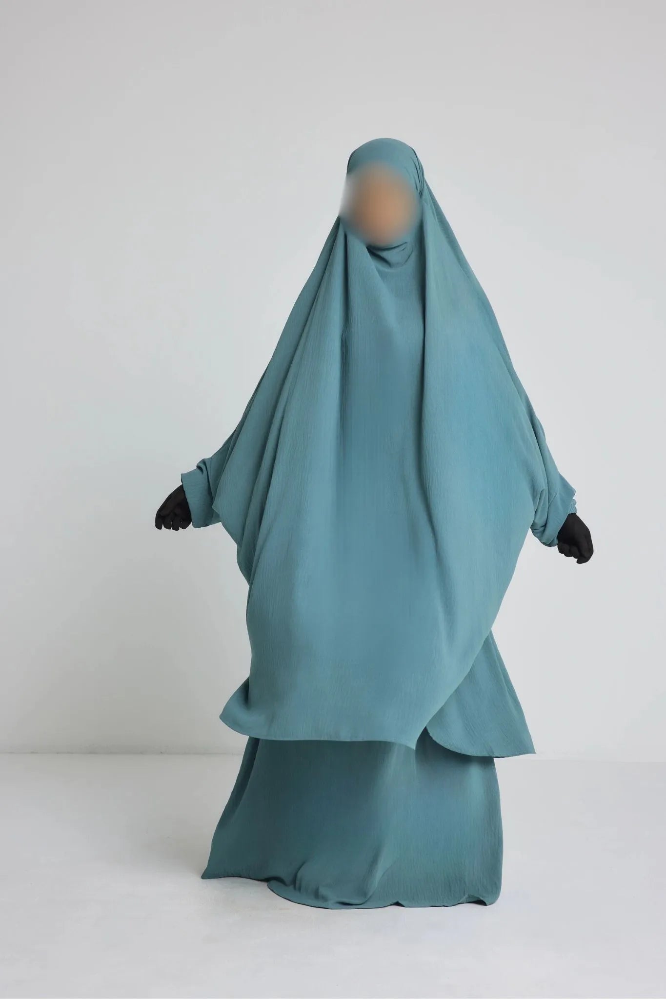 Composé d’un haut à capuche couvrant et d’une jupe longue assortie, cet ensemble jilbeb 2 pièces en jazz a été pensé pour allier pudeur, confort et praticité. Le tissu jazz, fluide et mat, est reconnu pour sa légèreté, son opacité naturelle et son tombé élégant qui ne colle pas au corps. Il offre un port agréable, même en été ou lors de longues journées en extérieur.