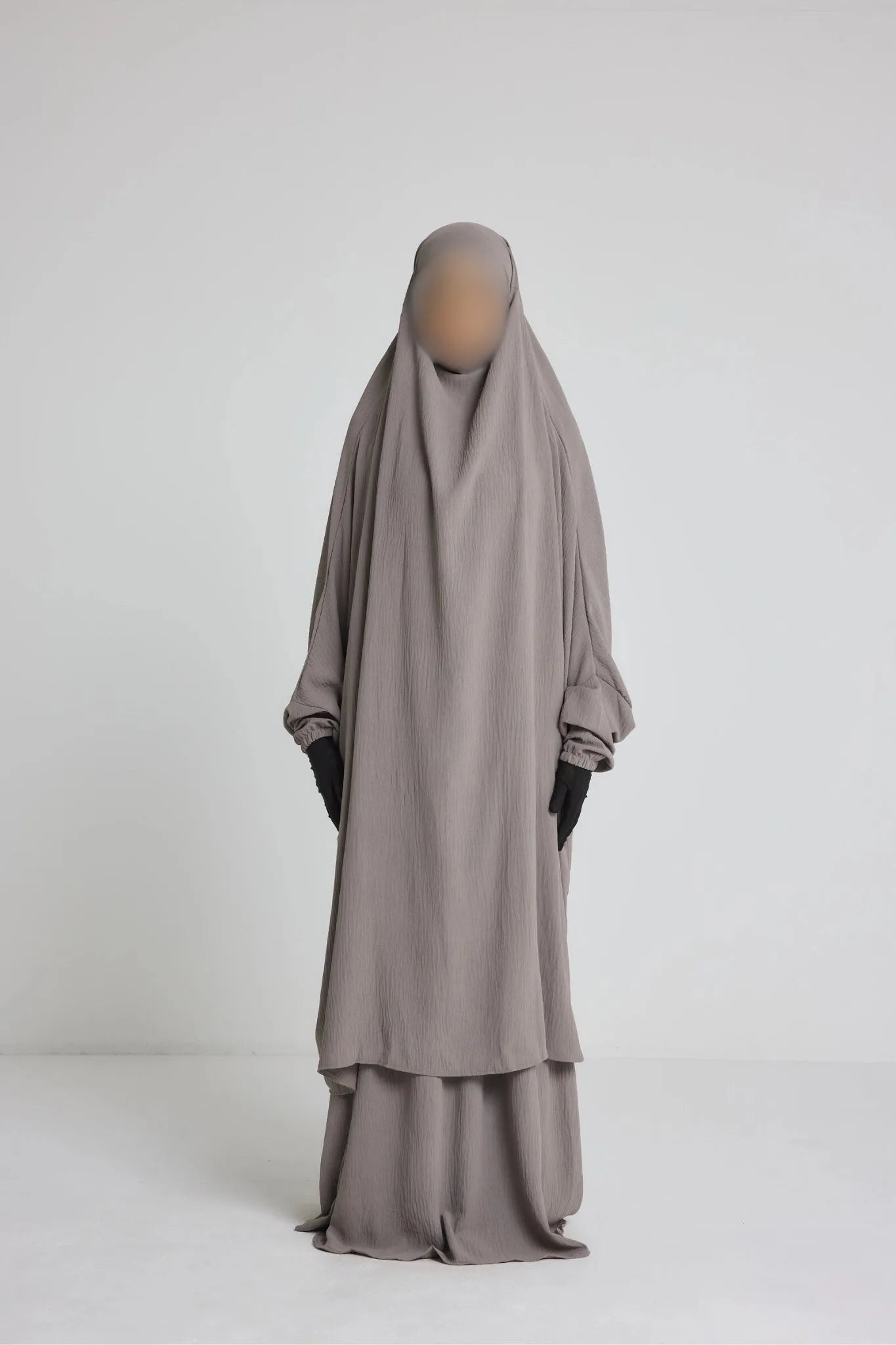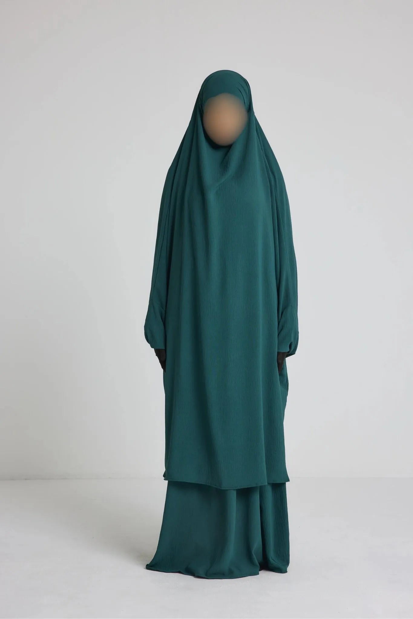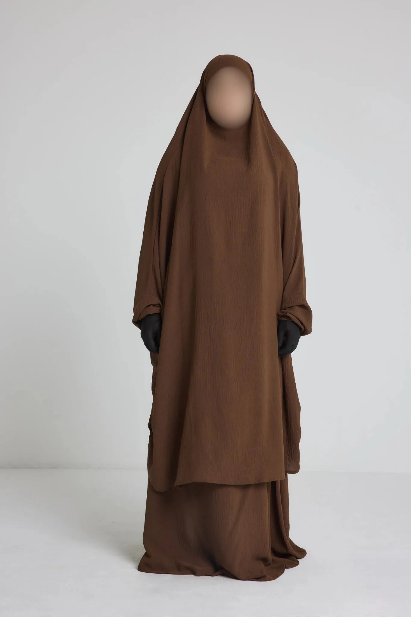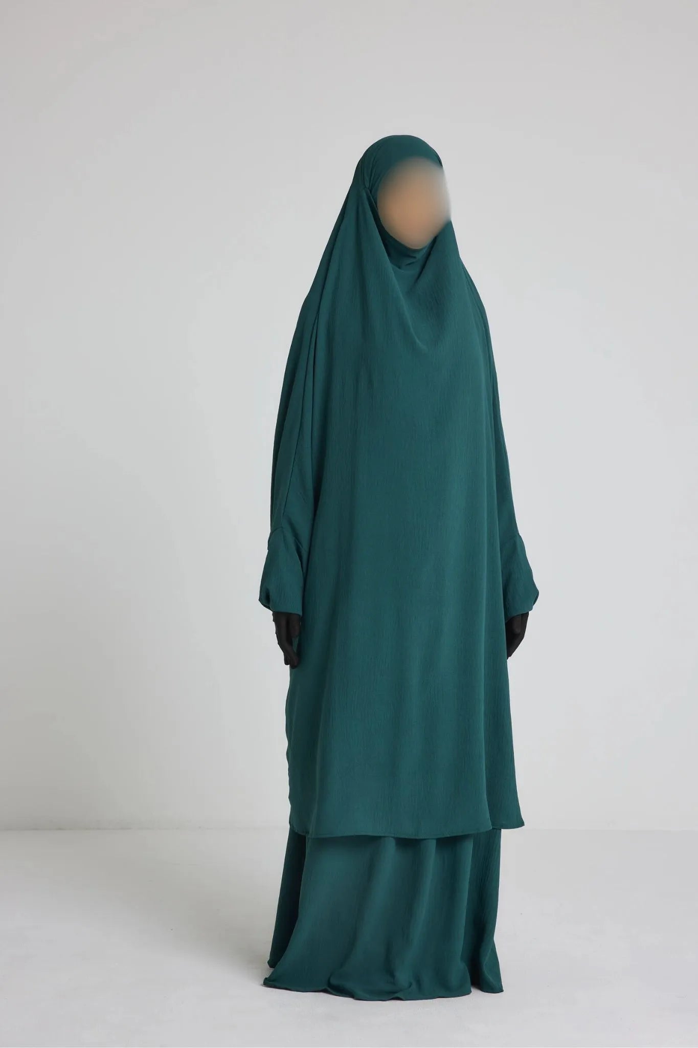 Composé d’un haut à capuche couvrant et d’une jupe longue assortie, cet ensemble jilbeb 2 pièces en jazz a été pensé pour allier pudeur, confort et praticité. Le tissu jazz, fluide et mat, est reconnu pour sa légèreté, son opacité naturelle et son tombé élégant qui ne colle pas au corps. Il offre un port agréable, même en été ou lors de longues journées en extérieur.