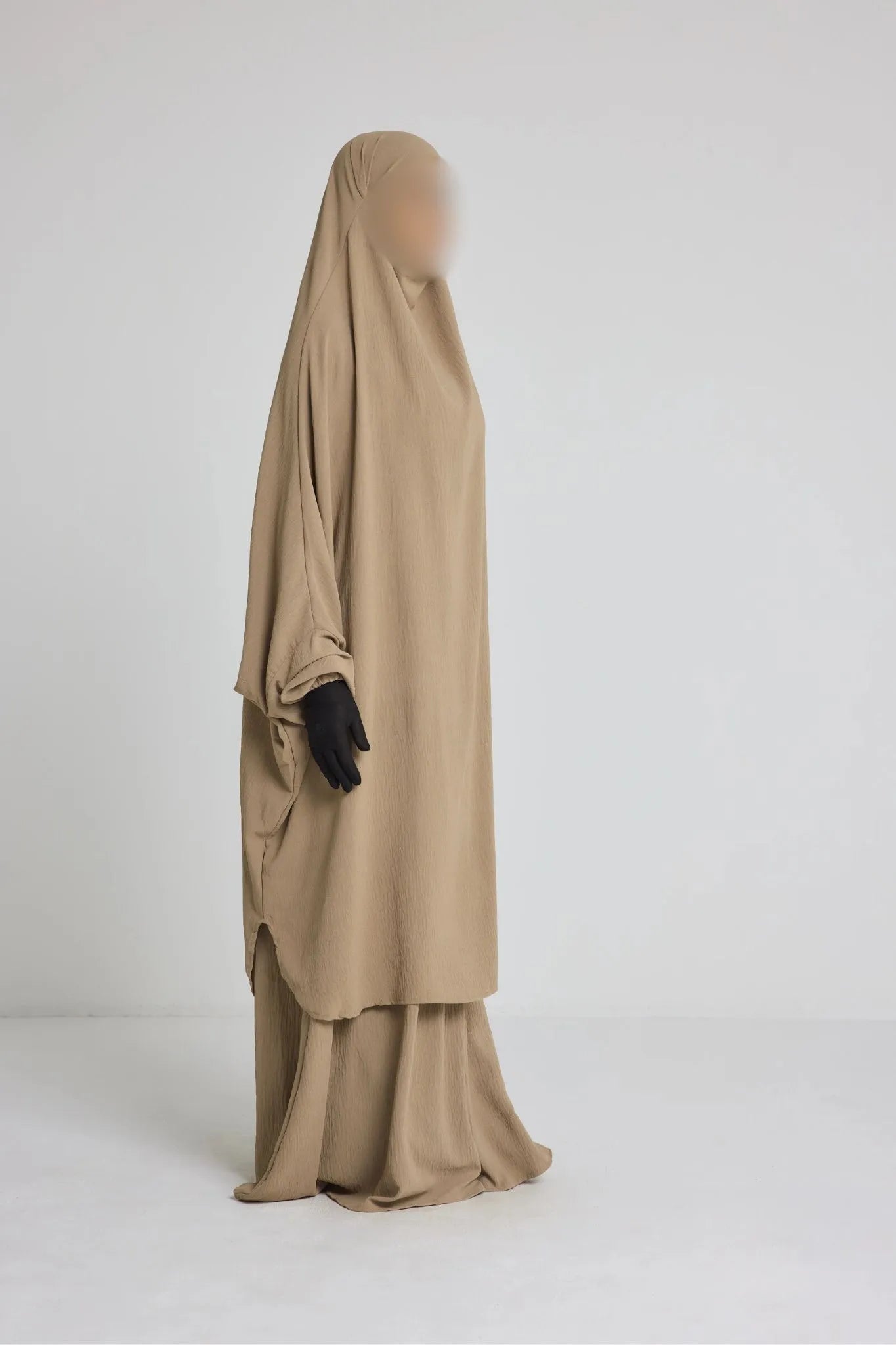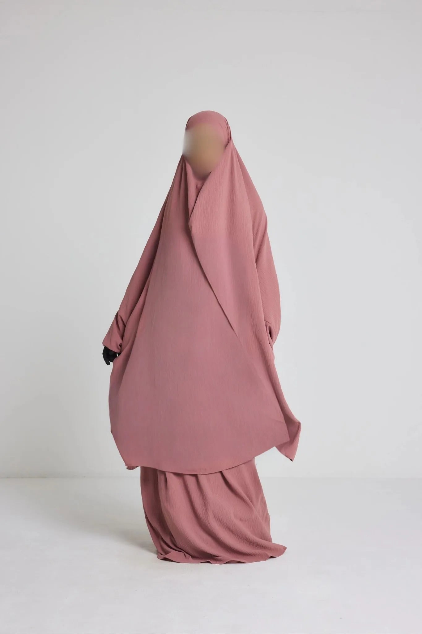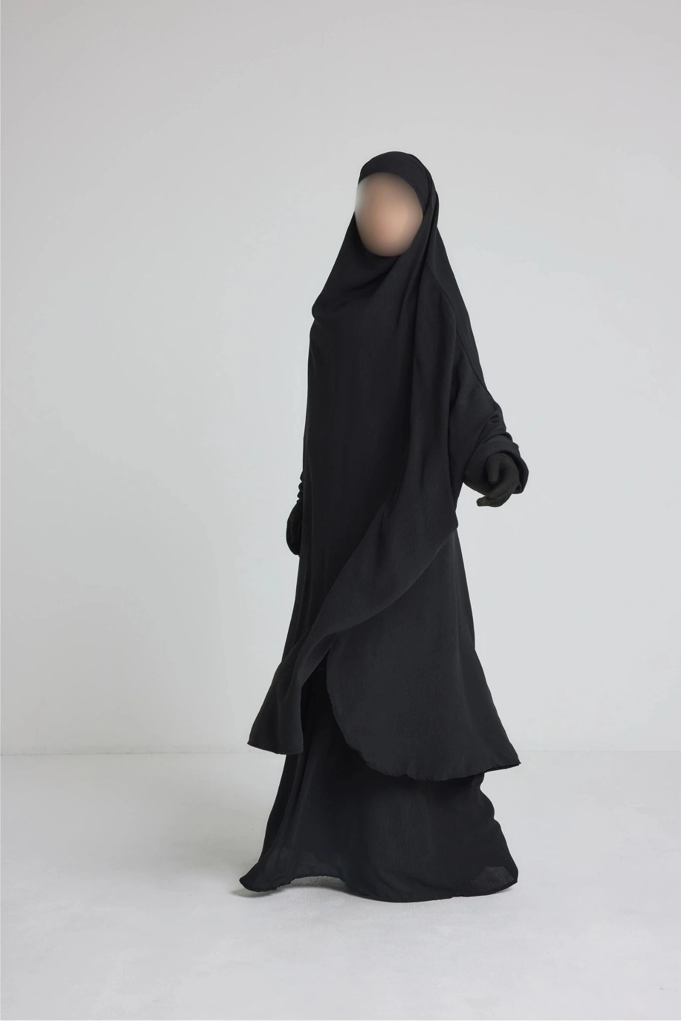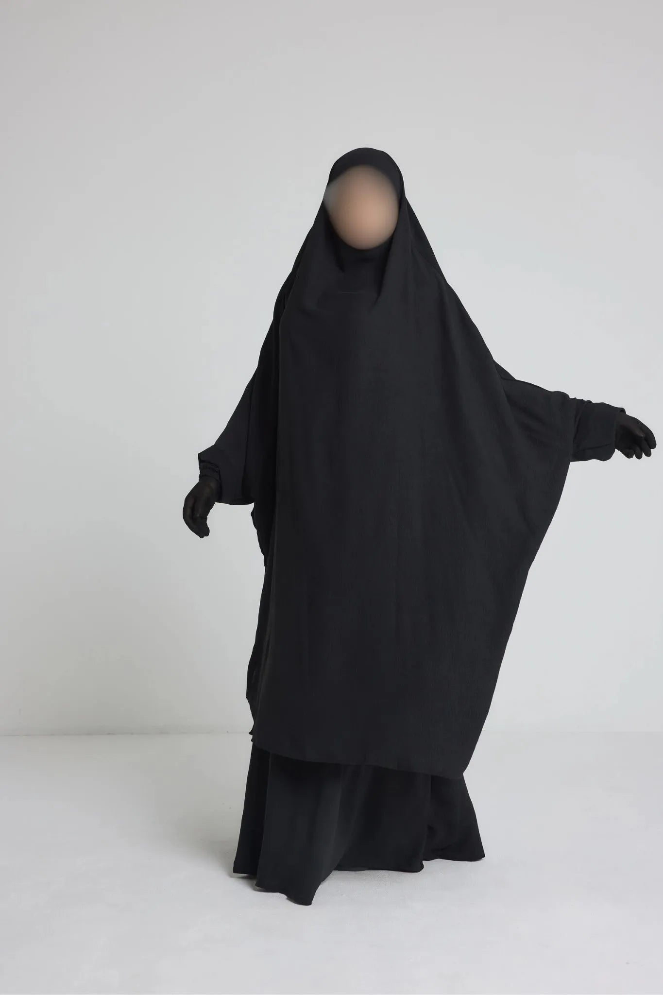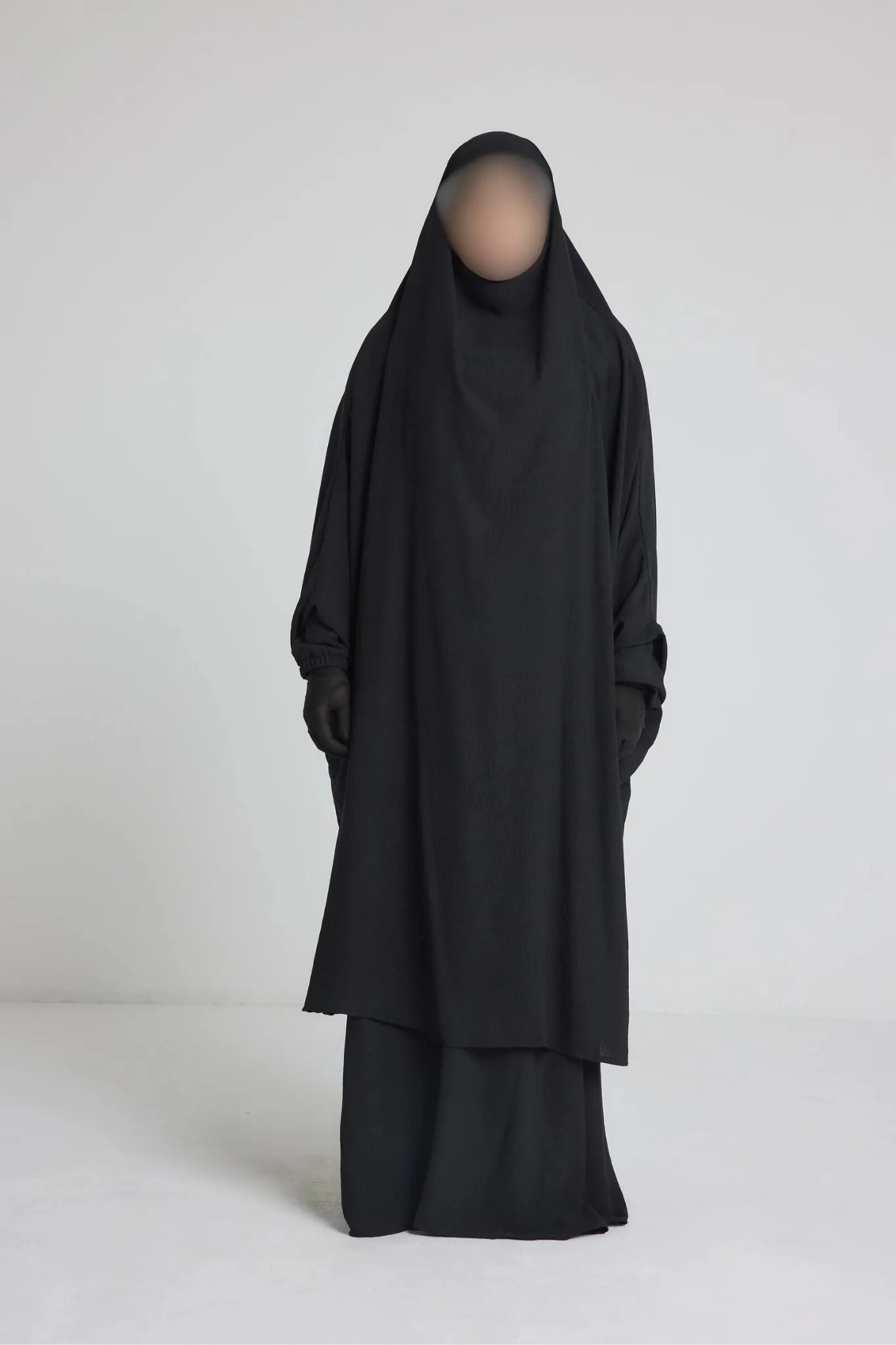 Le haut du jilbeb est ample, avec une coupe étudiée pour couvrir généreusement le buste, les épaules et le haut du dos. Il s’enfile rapidement grâce à l’élastique intégré sous le menton ou au bandeau intégré selon les modèles, et assure une bonne tenue sans glisser. La jupe, large et évasée, est dotée d’une taille élastique qui s’adapte confortablement à toutes les morphologies tout en garantissant un maintien discret.