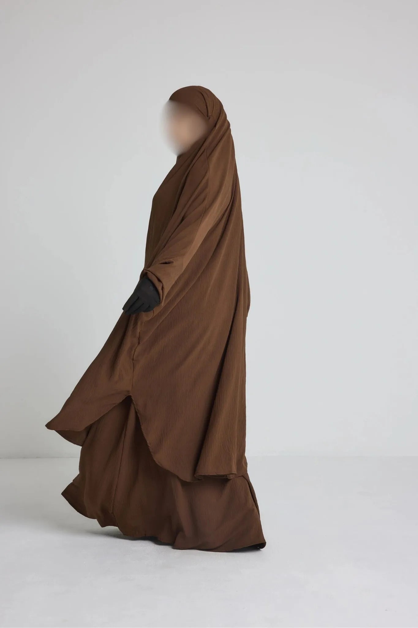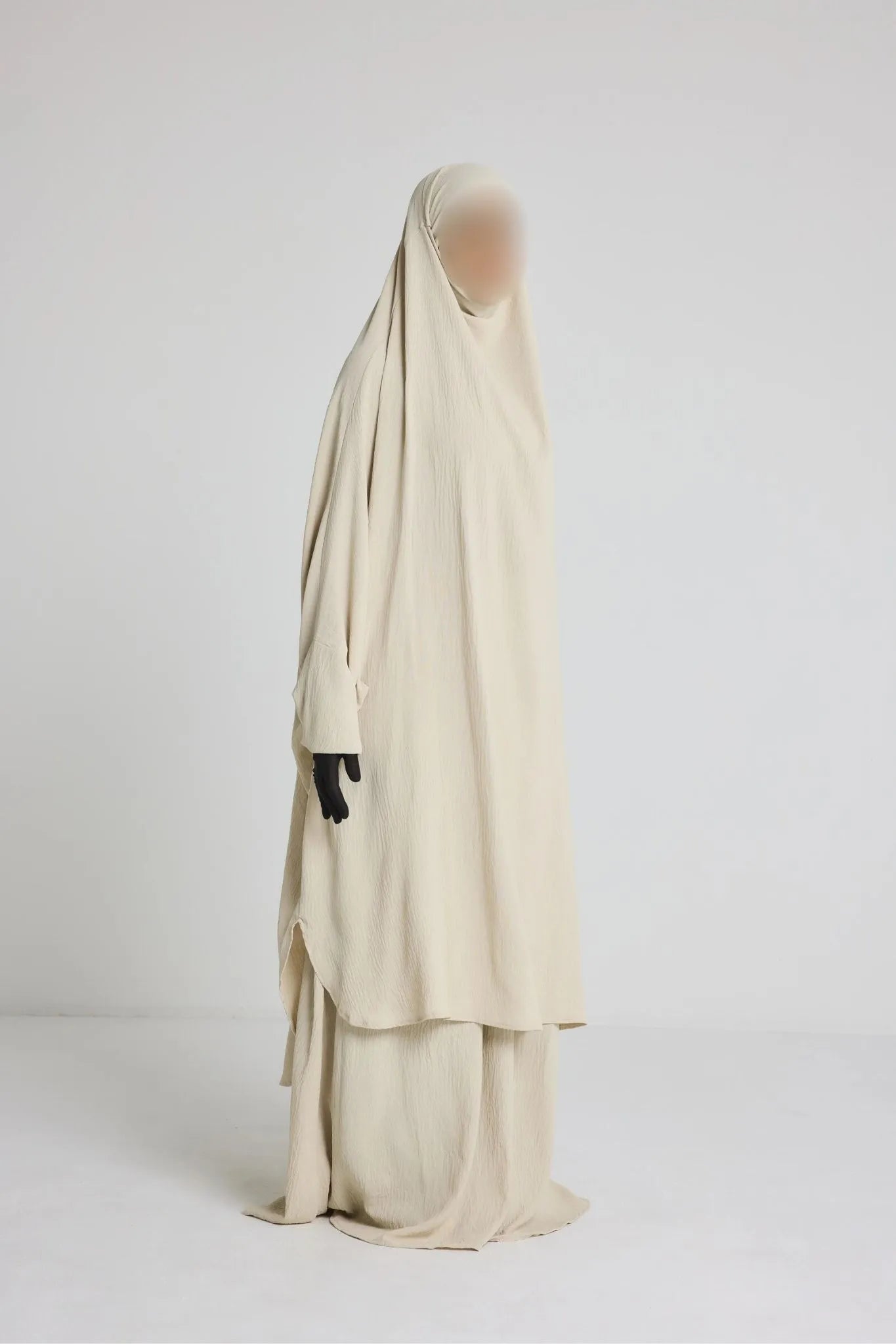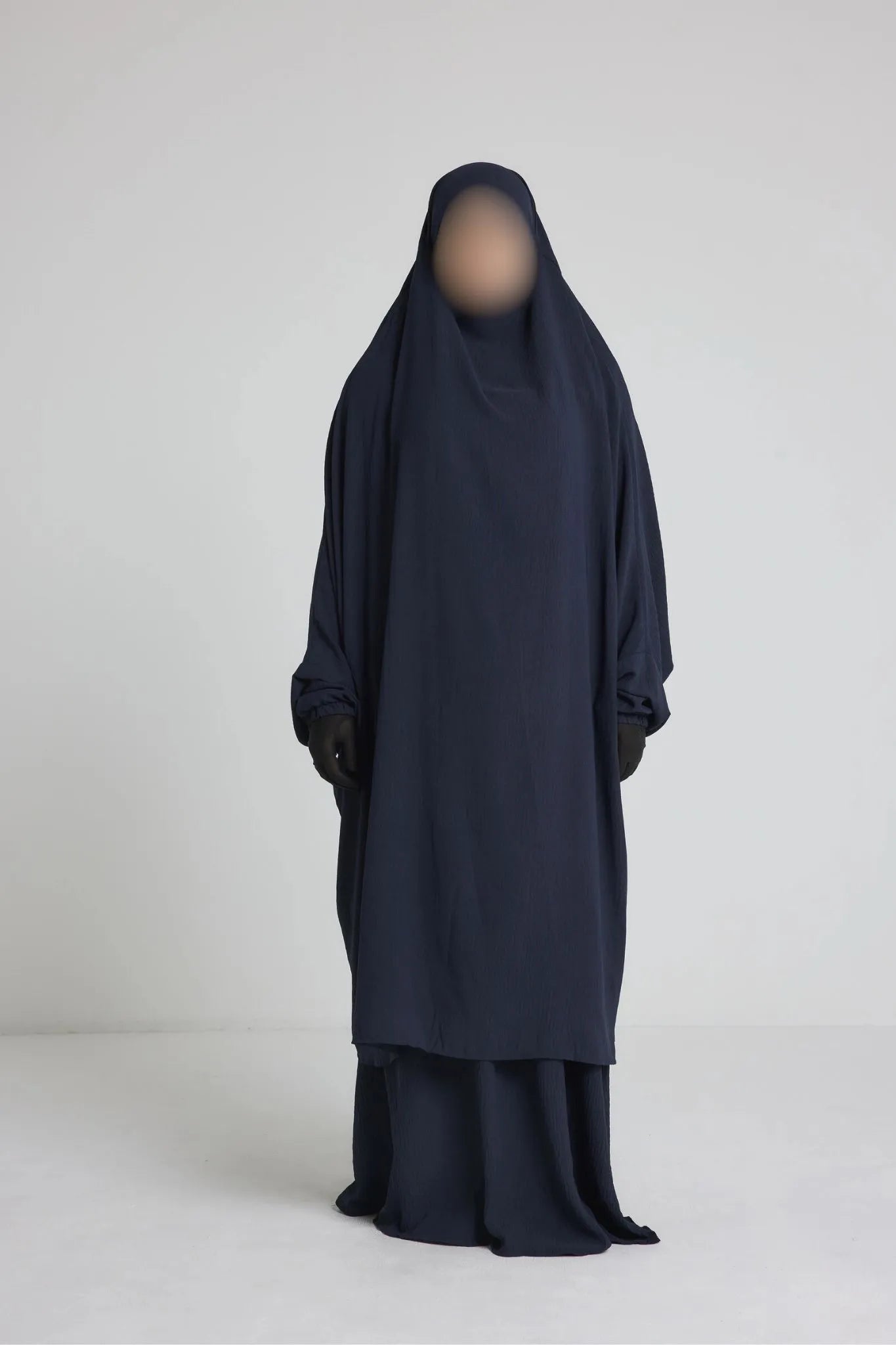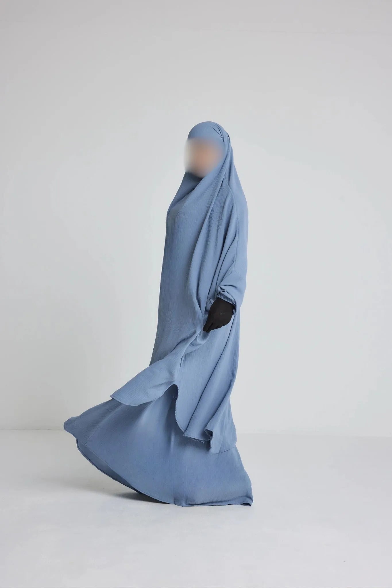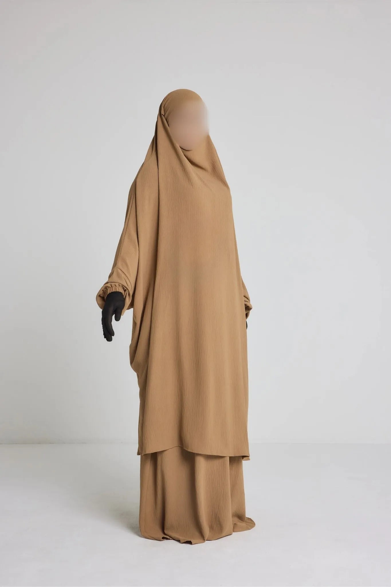Le haut du jilbeb est ample, avec une coupe étudiée pour couvrir généreusement le buste, les épaules et le haut du dos. Il s’enfile rapidement grâce à l’élastique intégré sous le menton ou au bandeau intégré selon les modèles, et assure une bonne tenue sans glisser. La jupe, large et évasée, est dotée d’une taille élastique qui s’adapte confortablement à toutes les morphologies tout en garantissant un maintien discret.