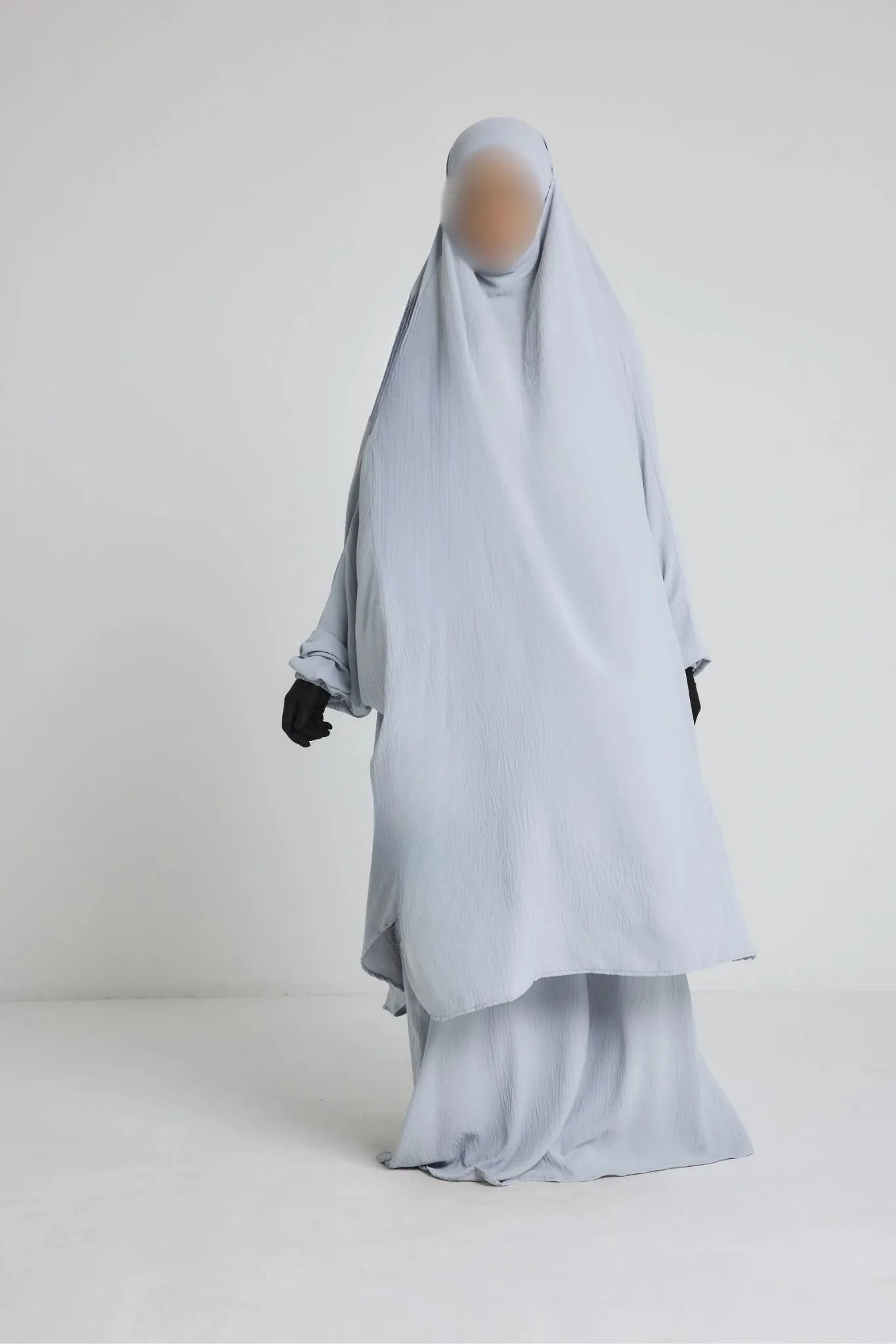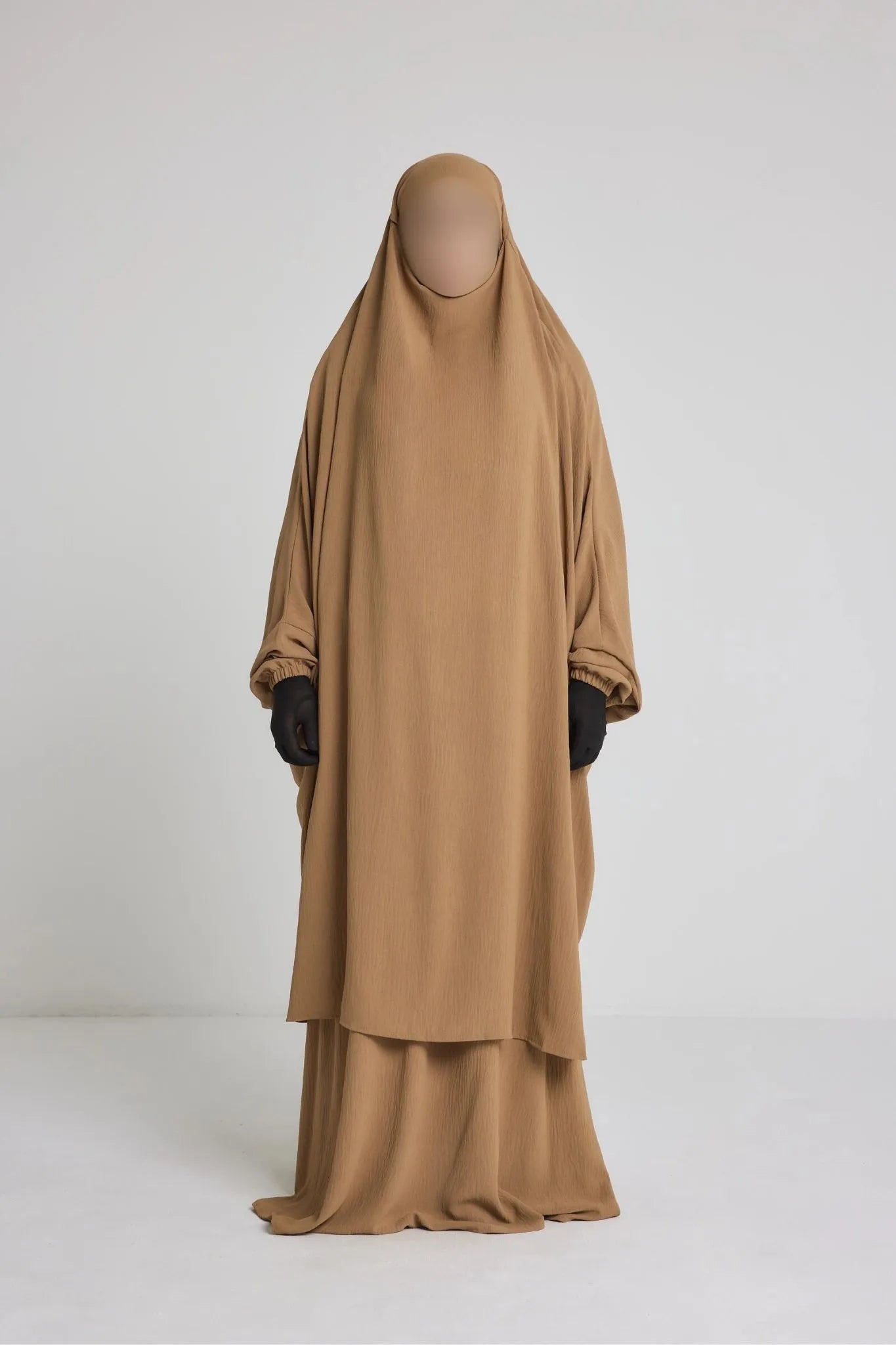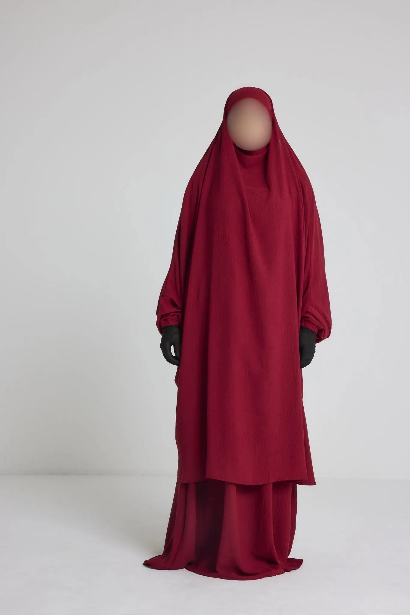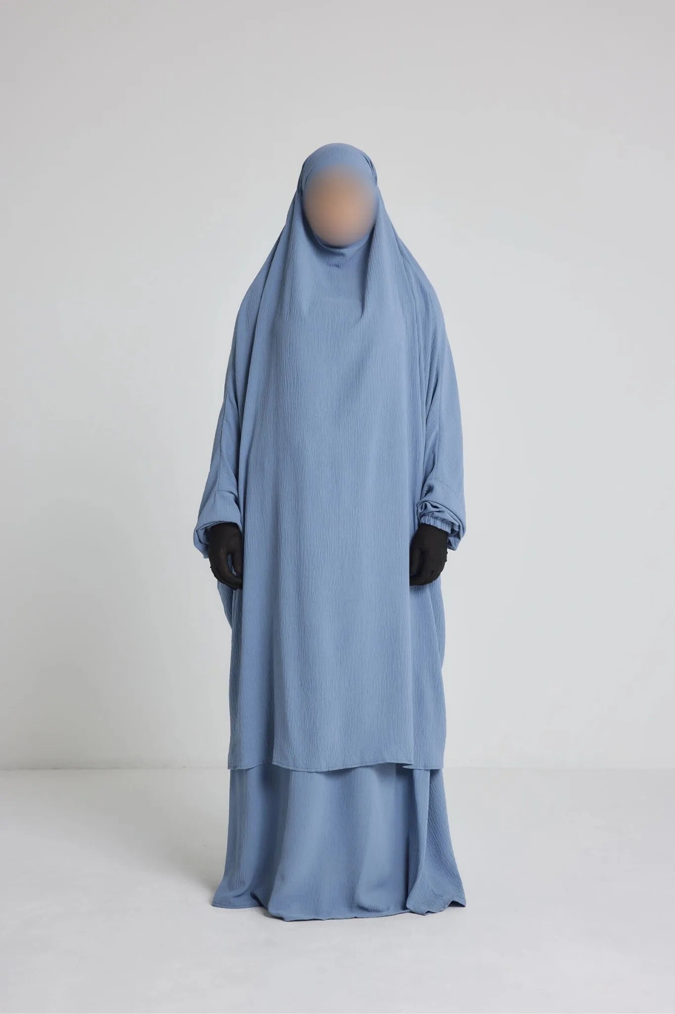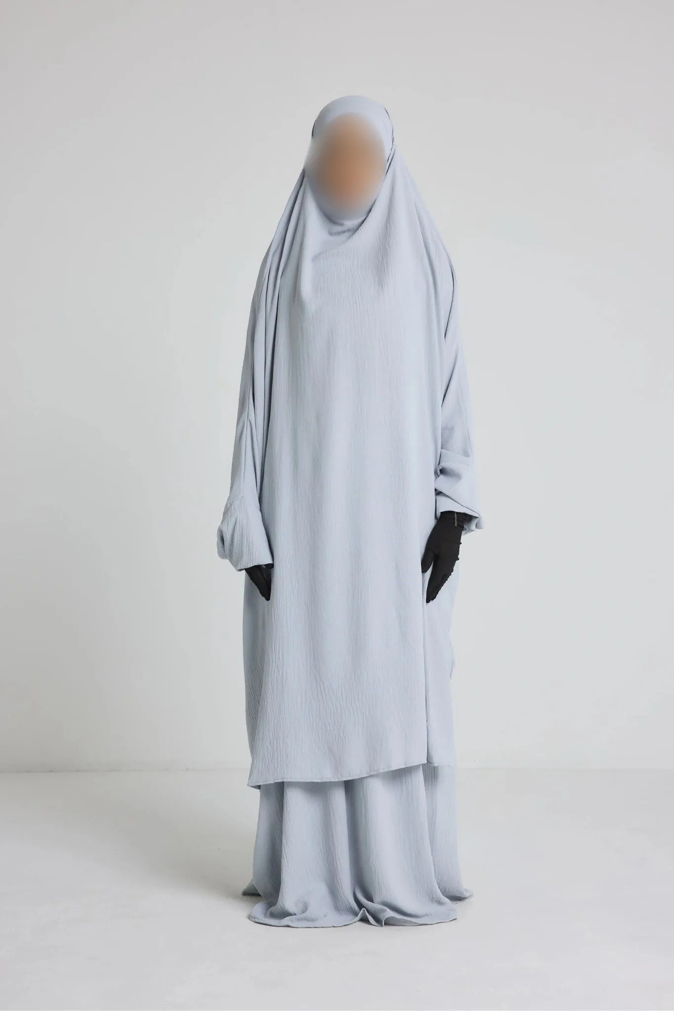 Le haut du jilbeb est ample, avec une coupe étudiée pour couvrir généreusement le buste, les épaules et le haut du dos. Il s’enfile rapidement grâce à l’élastique intégré sous le menton ou au bandeau intégré selon les modèles, et assure une bonne tenue sans glisser. La jupe, large et évasée, est dotée d’une taille élastique qui s’adapte confortablement à toutes les morphologies tout en garantissant un maintien discret.