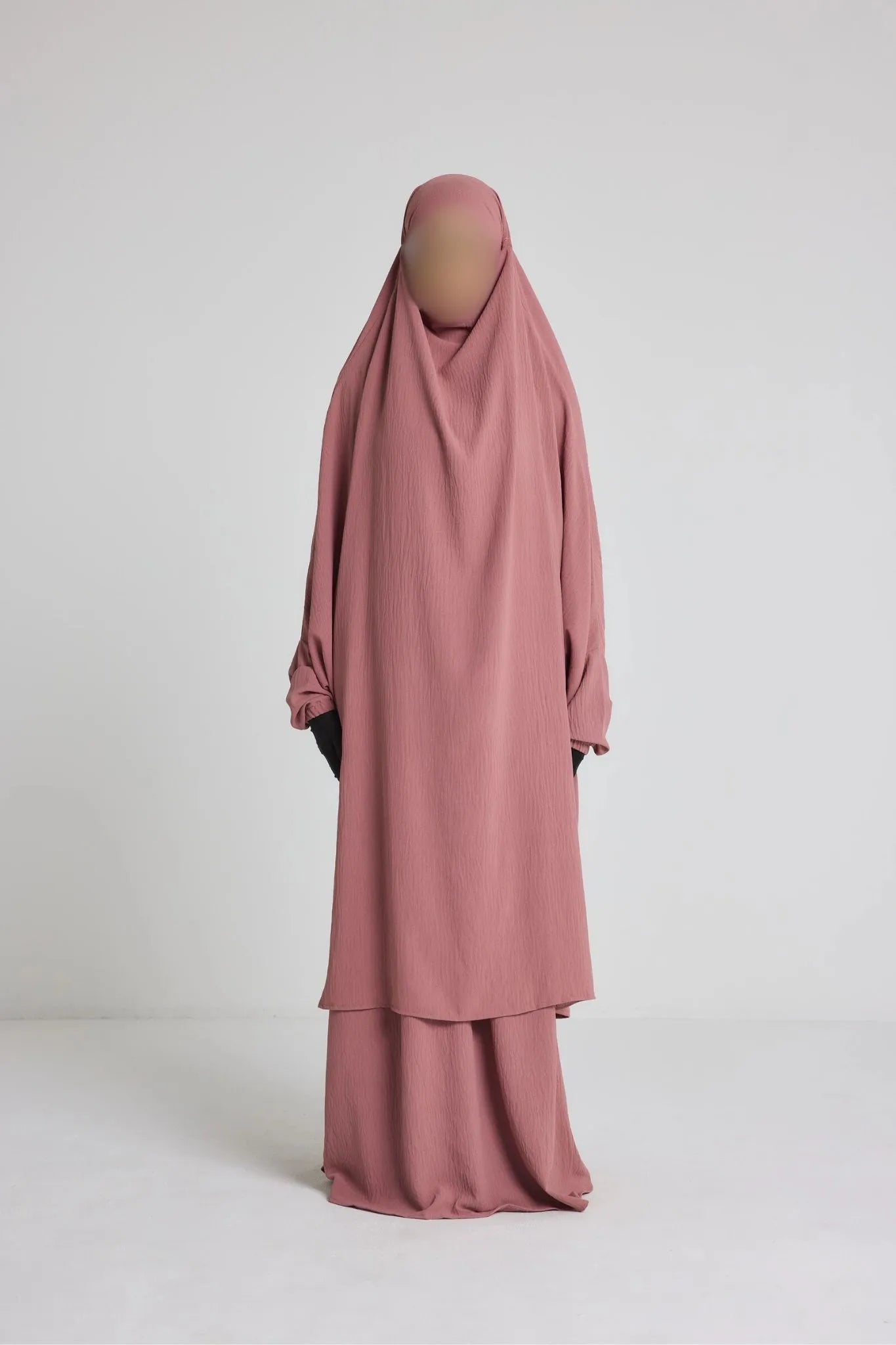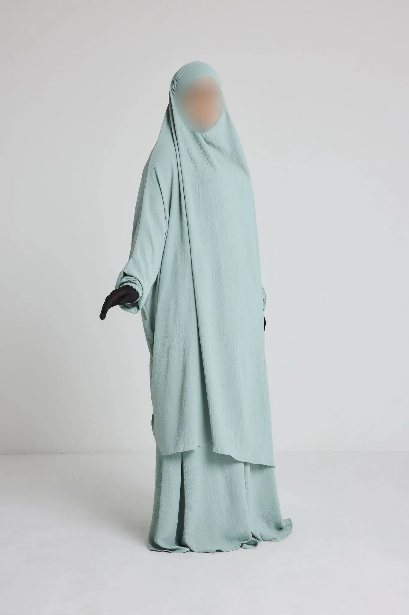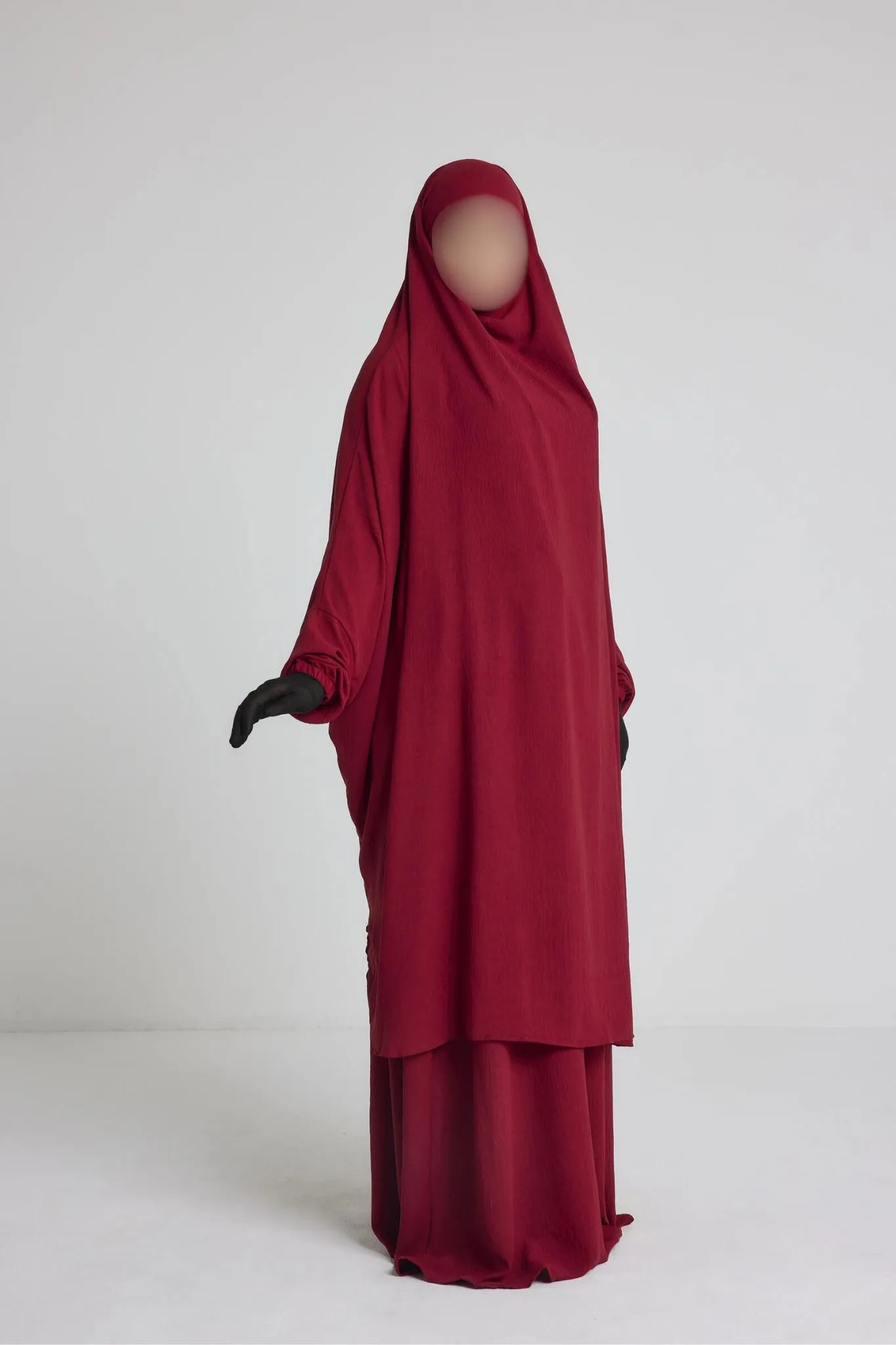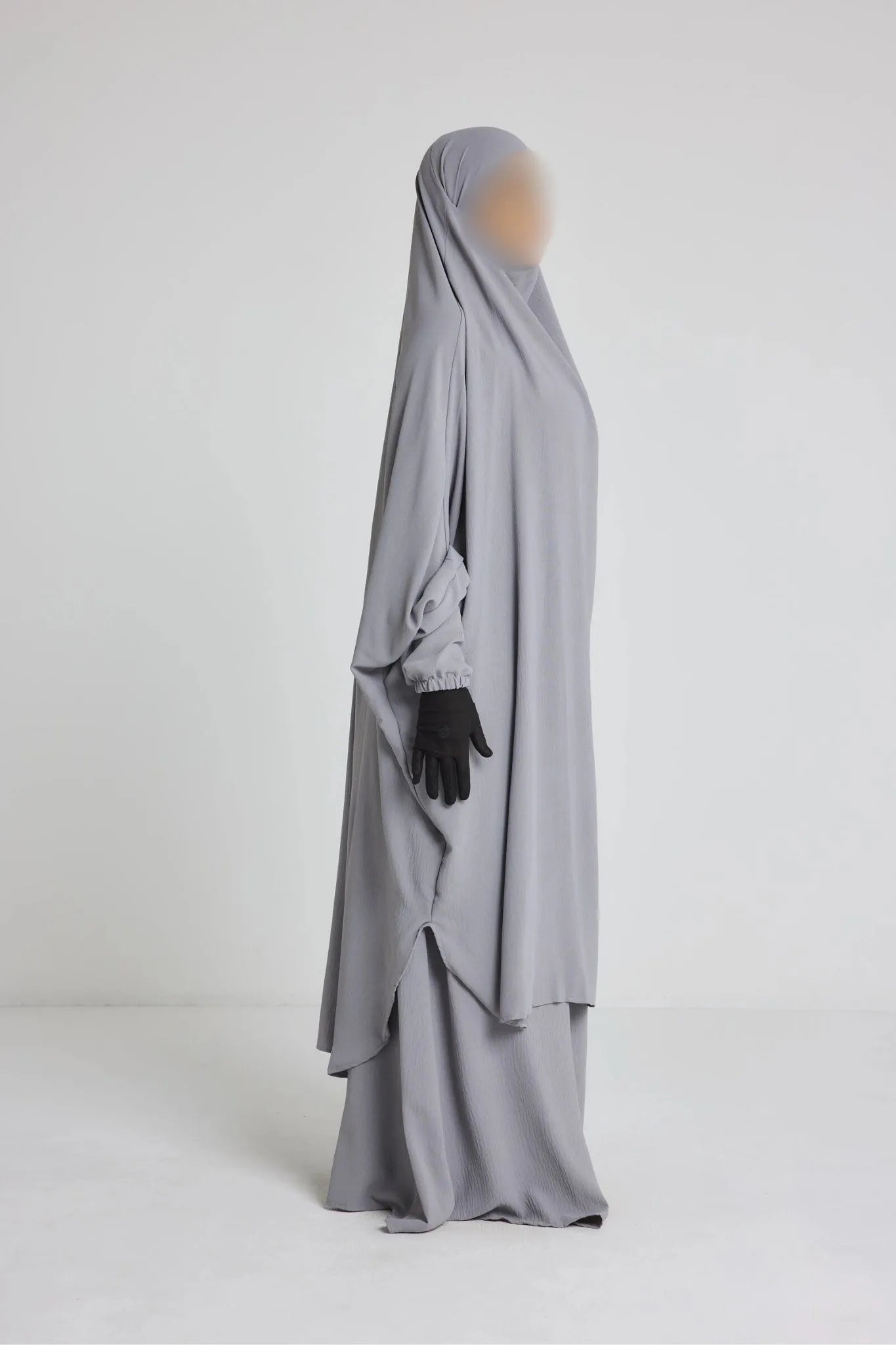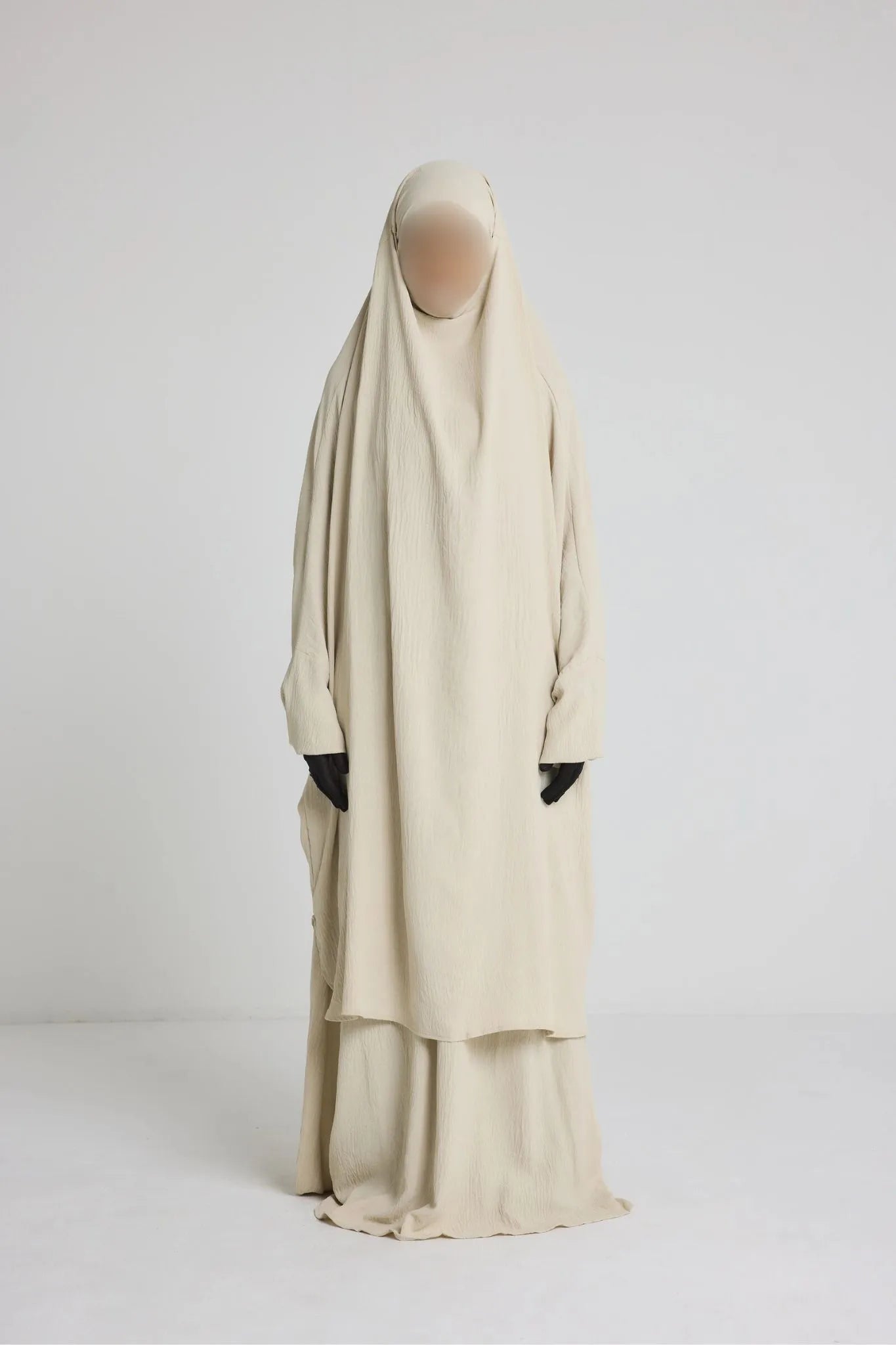 Le haut du jilbeb est ample, avec une coupe étudiée pour couvrir généreusement le buste, les épaules et le haut du dos. Il s’enfile rapidement grâce à l’élastique intégré sous le menton ou au bandeau intégré selon les modèles, et assure une bonne tenue sans glisser. La jupe, large et évasée, est dotée d’une taille élastique qui s’adapte confortablement à toutes les morphologies tout en garantissant un maintien discret.