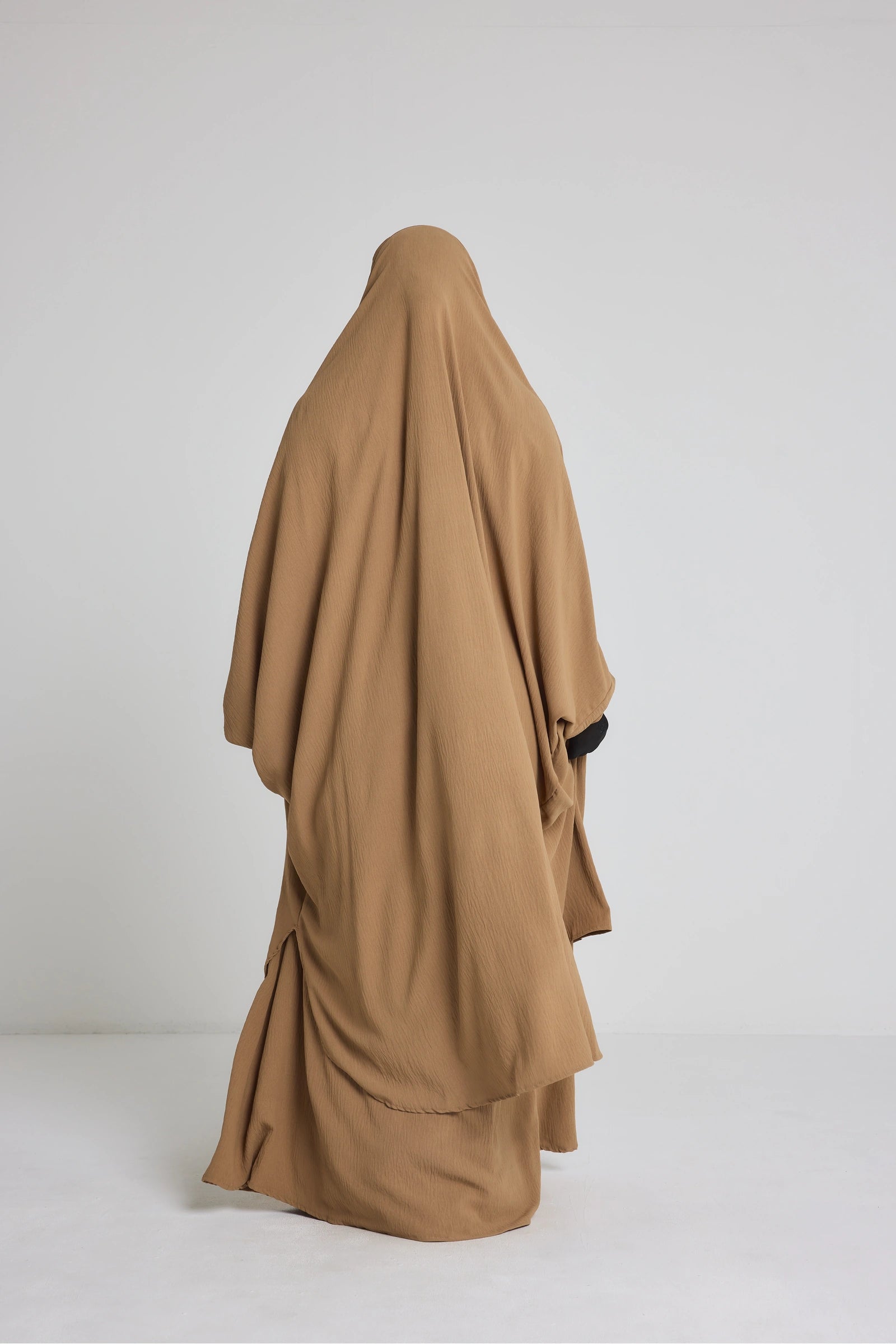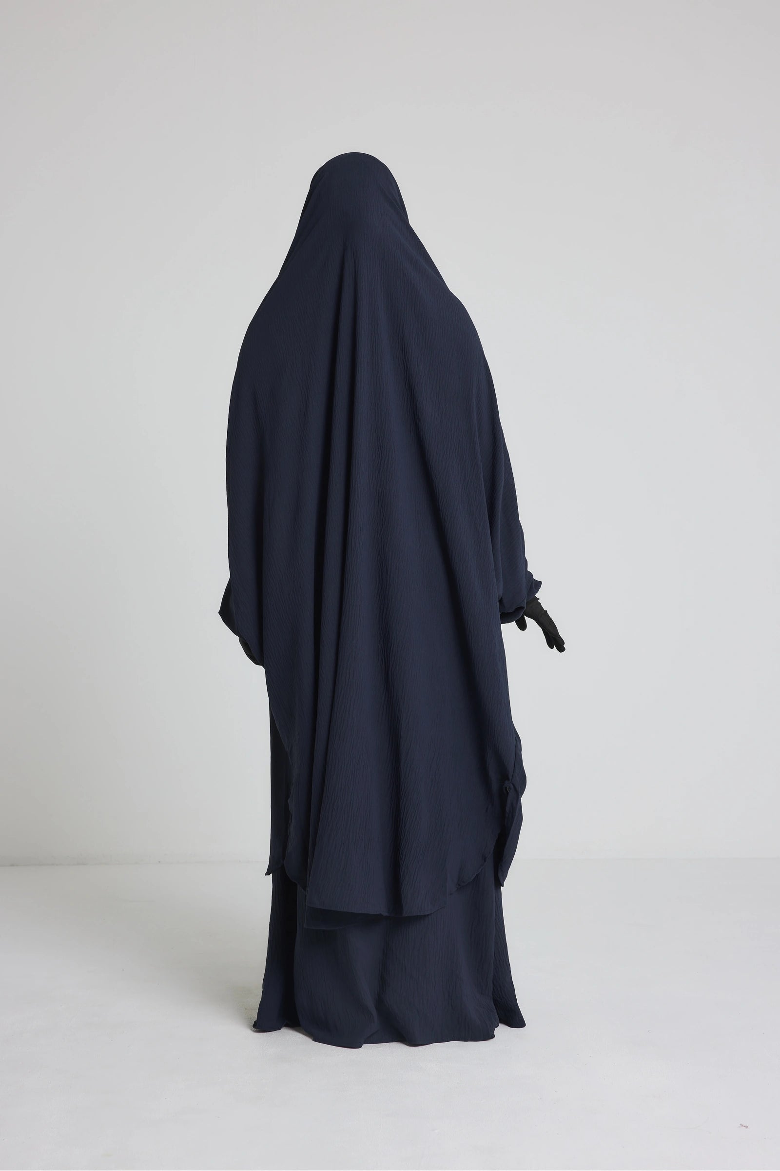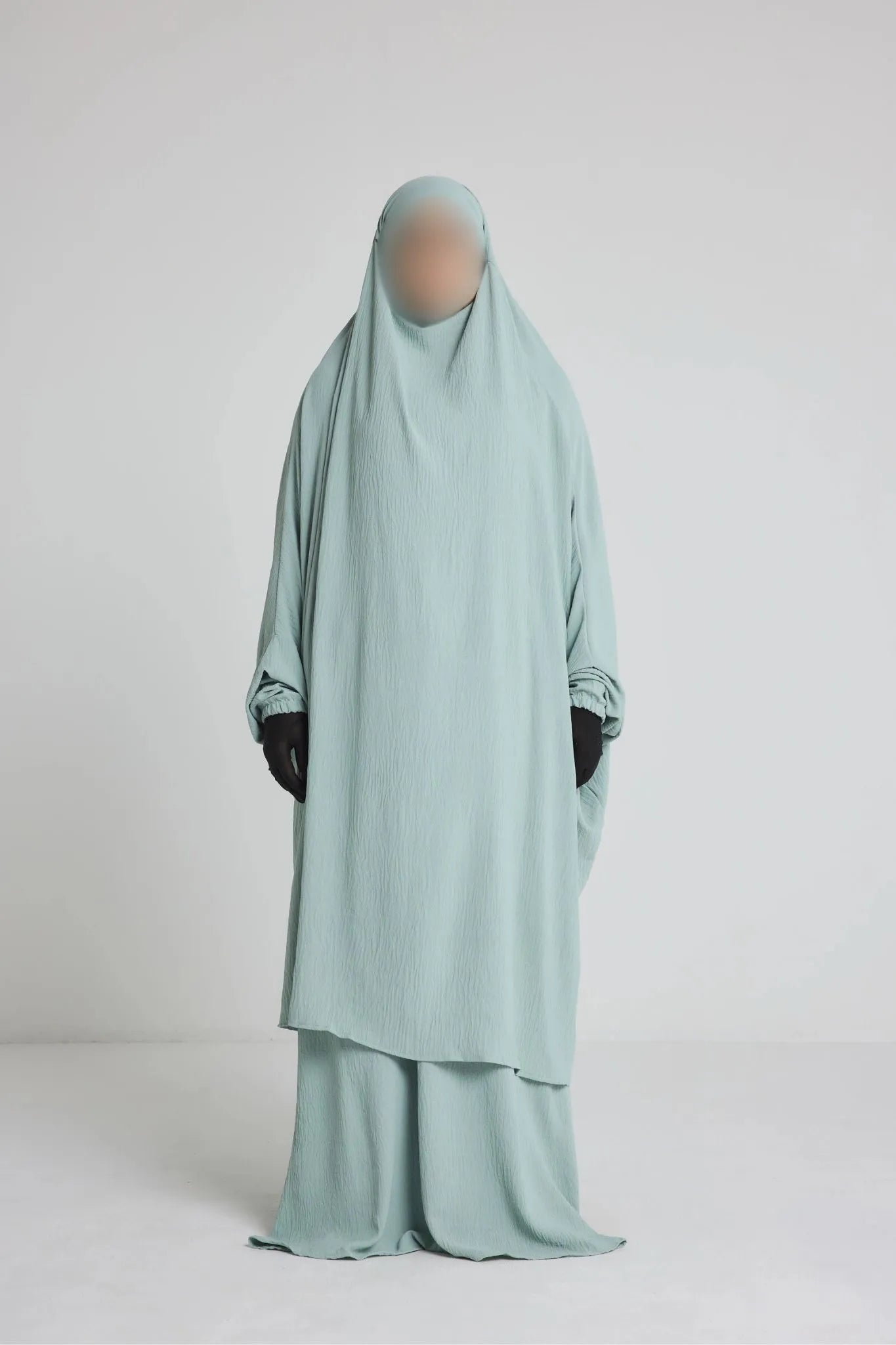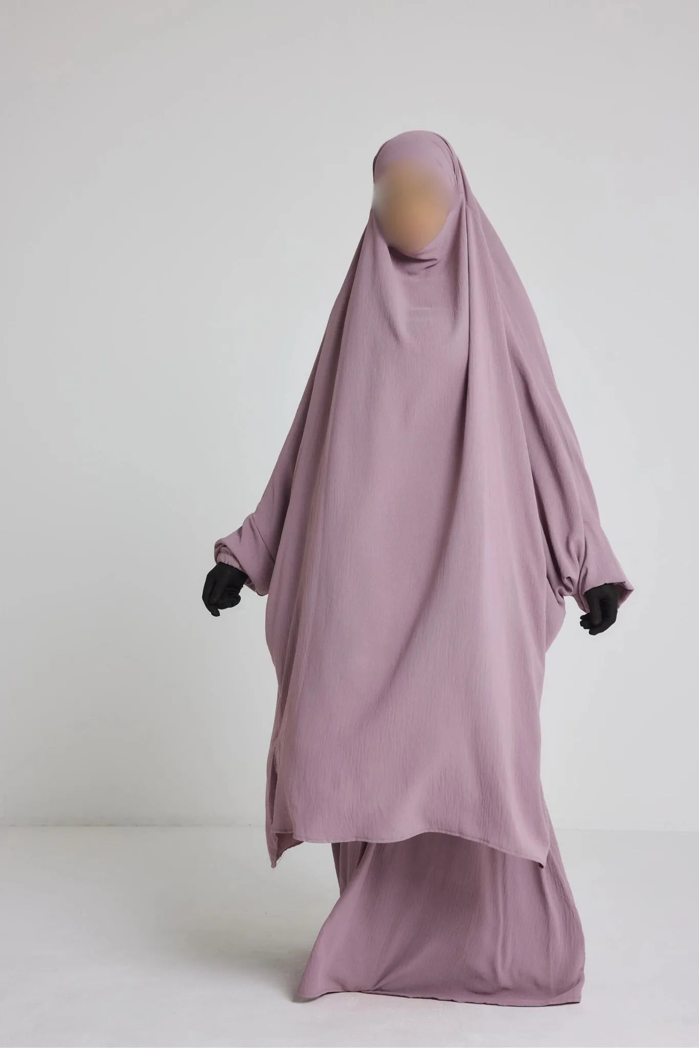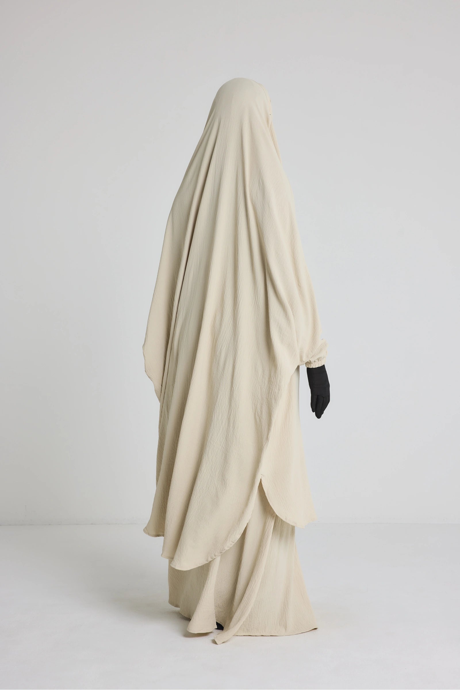 Le haut du jilbeb est ample, avec une coupe étudiée pour couvrir généreusement le buste, les épaules et le haut du dos. Il s’enfile rapidement grâce à l’élastique intégré sous le menton ou au bandeau intégré selon les modèles, et assure une bonne tenue sans glisser. La jupe, large et évasée, est dotée d’une taille élastique qui s’adapte confortablement à toutes les morphologies tout en garantissant un maintien discret.