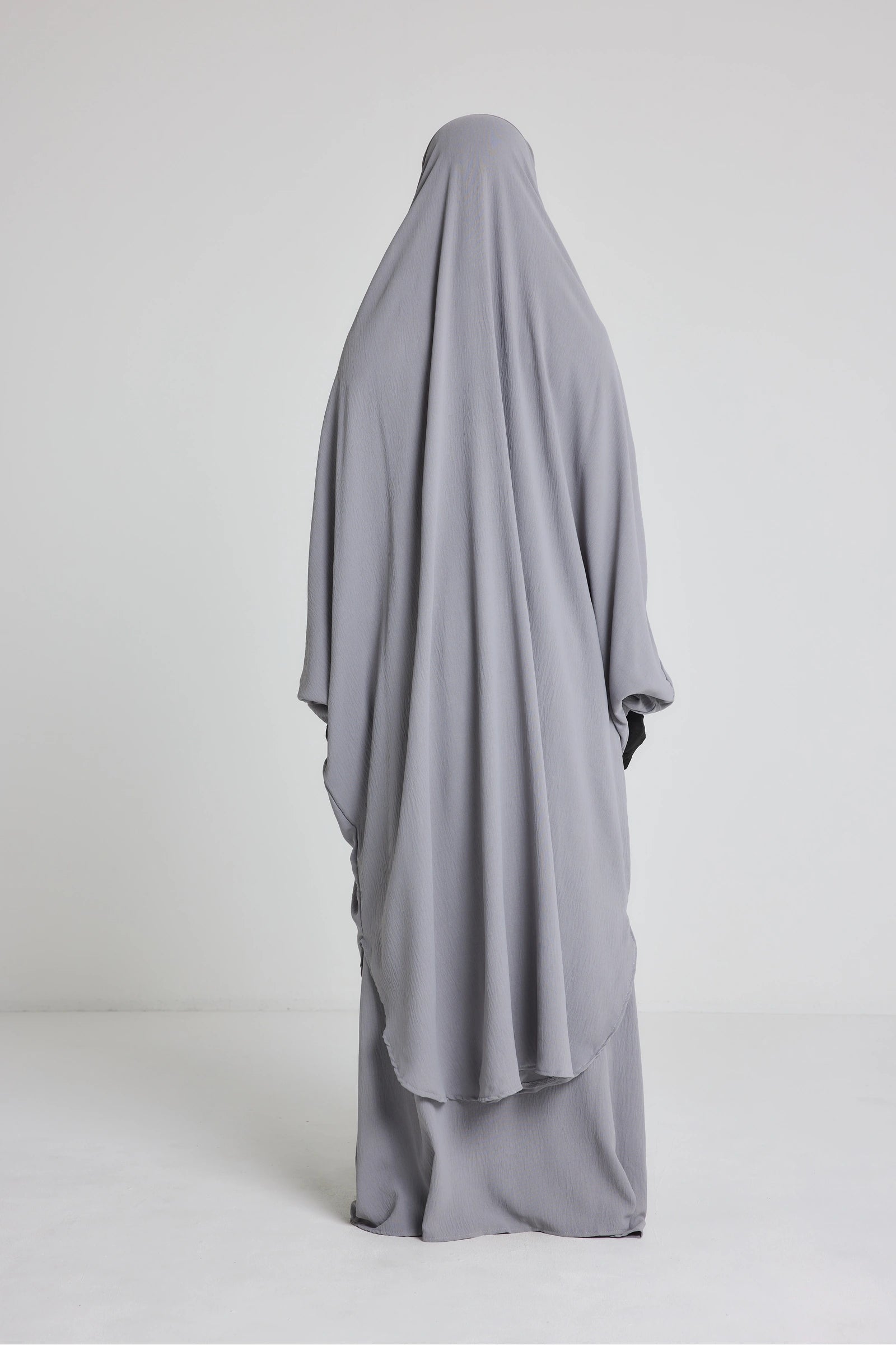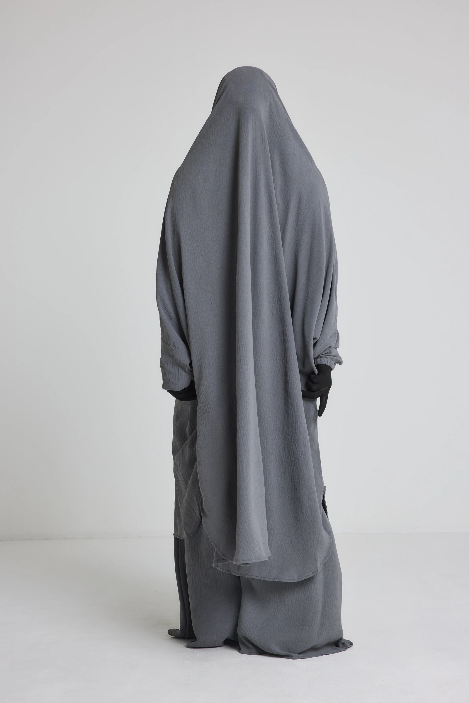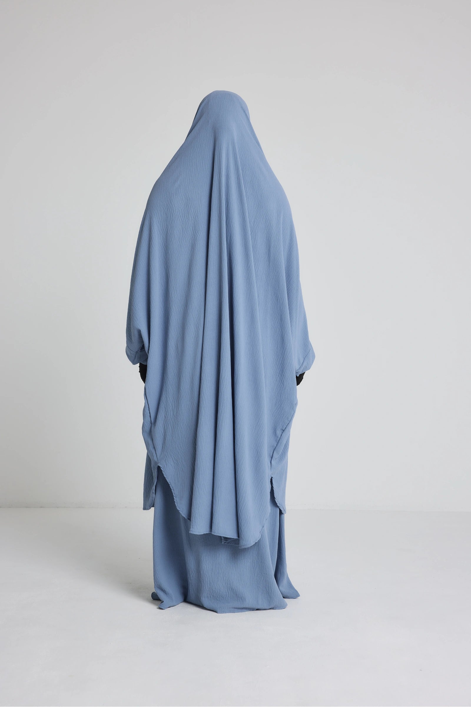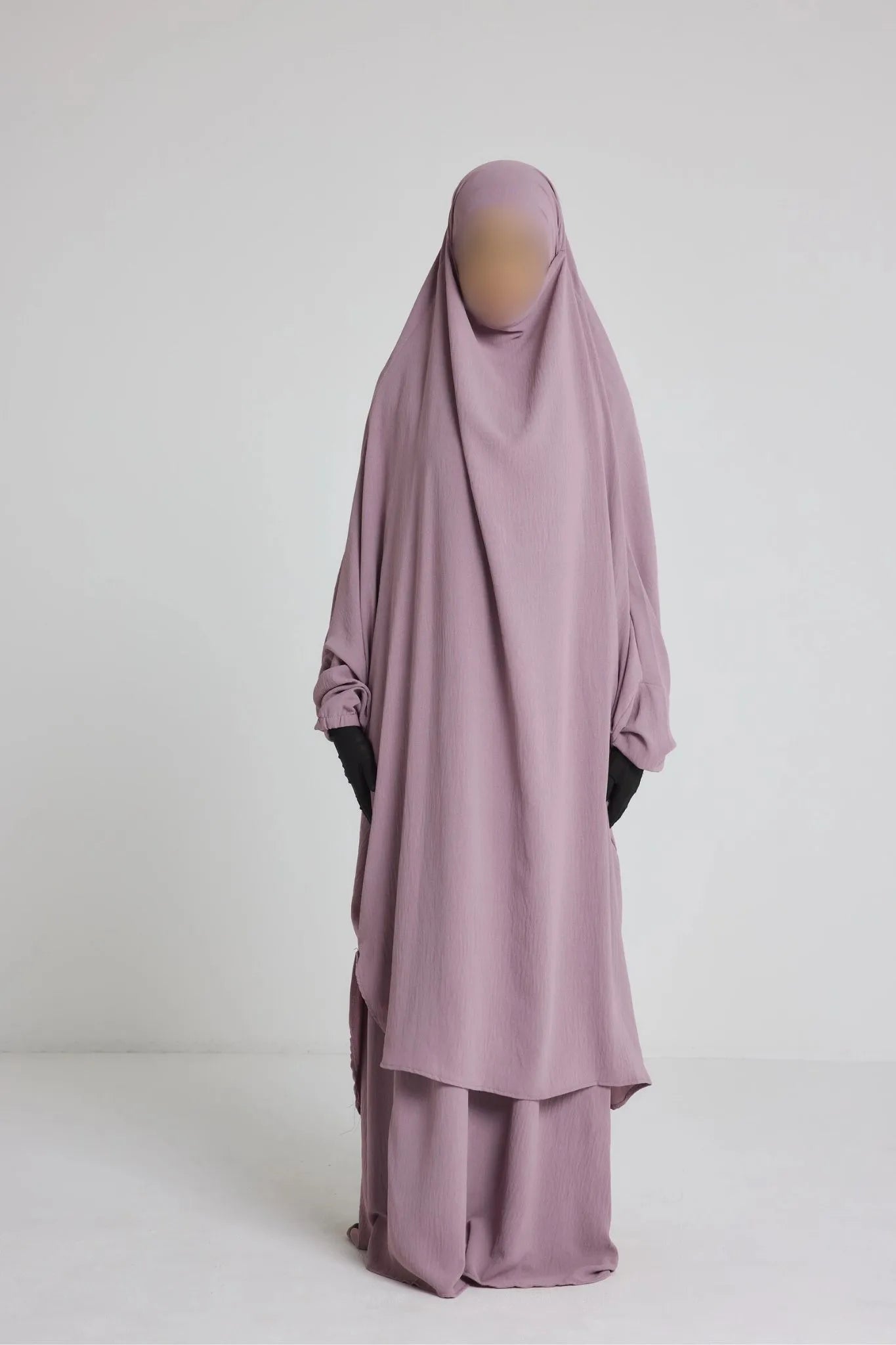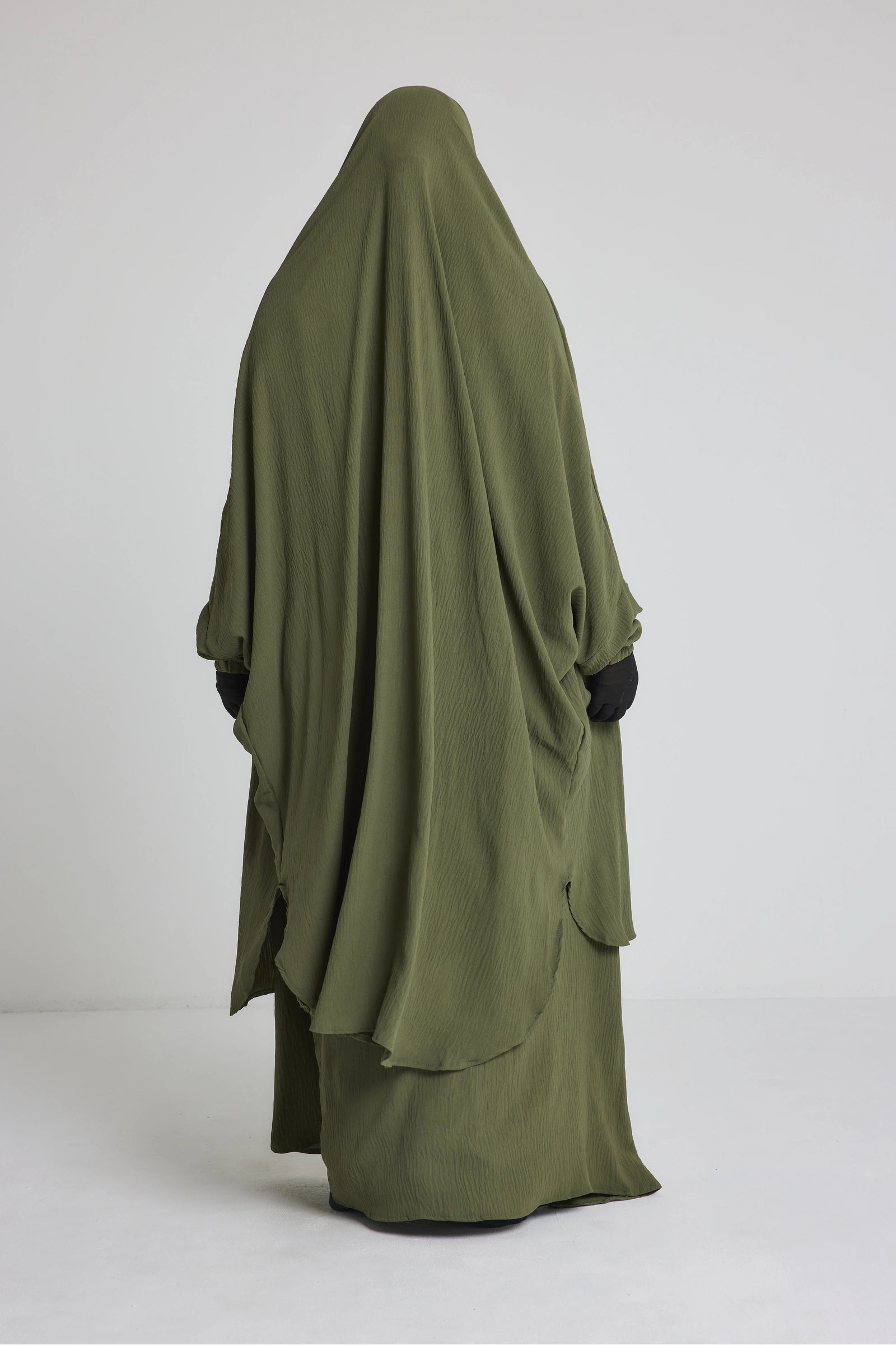 Le haut du jilbeb est ample, avec une coupe étudiée pour couvrir généreusement le buste, les épaules et le haut du dos. Il s’enfile rapidement grâce à l’élastique intégré sous le menton ou au bandeau intégré selon les modèles, et assure une bonne tenue sans glisser. La jupe, large et évasée, est dotée d’une taille élastique qui s’adapte confortablement à toutes les morphologies tout en garantissant un maintien discret.