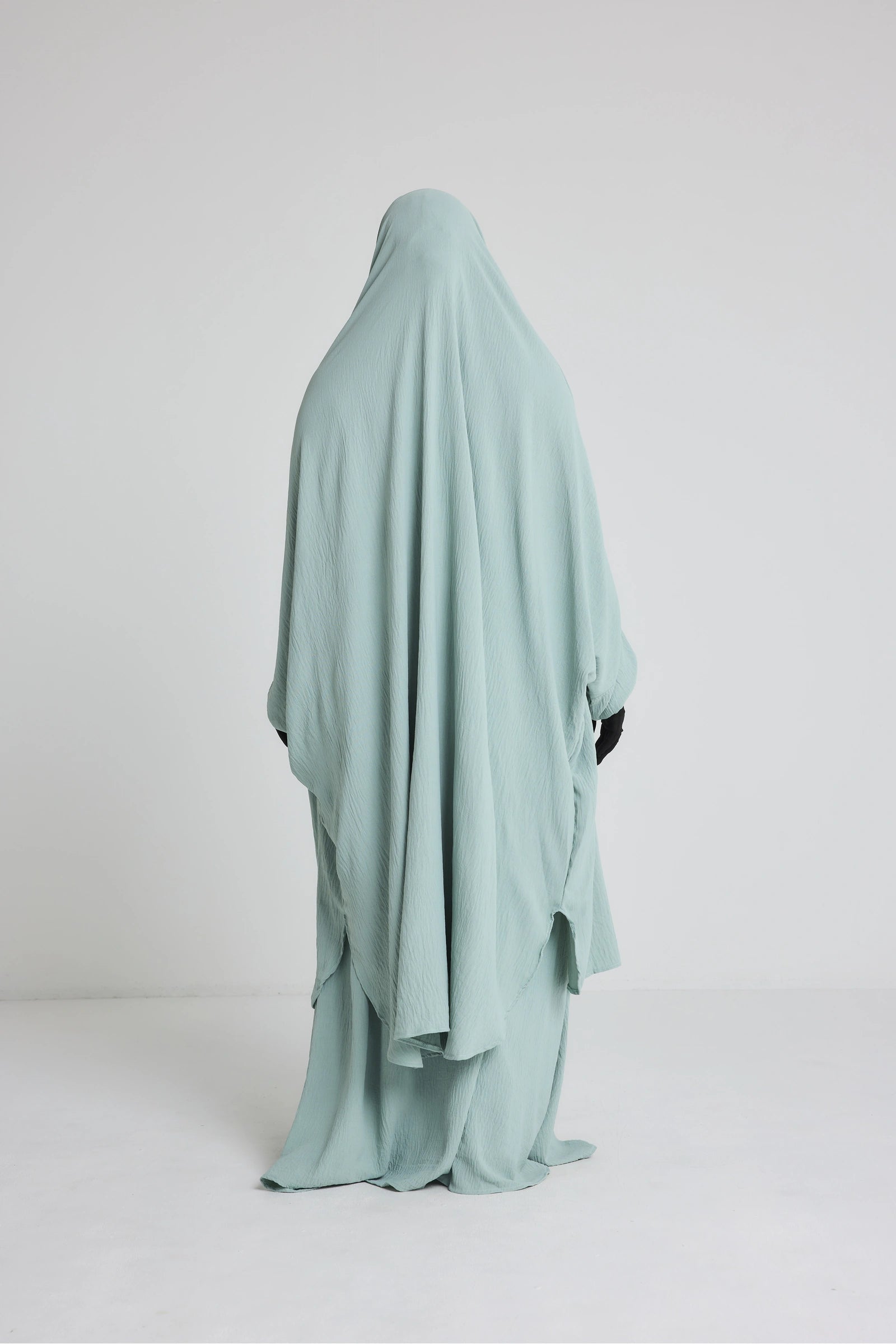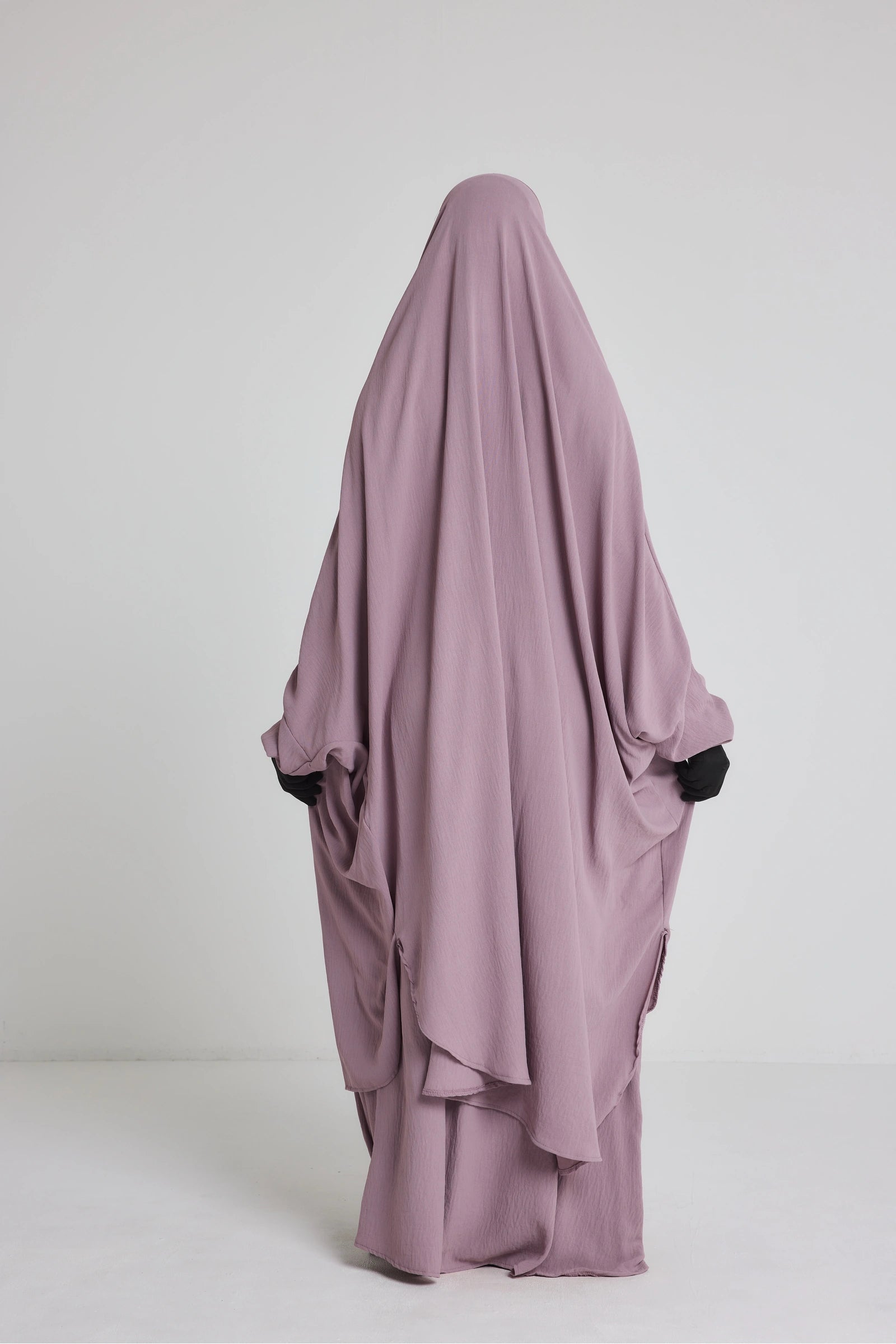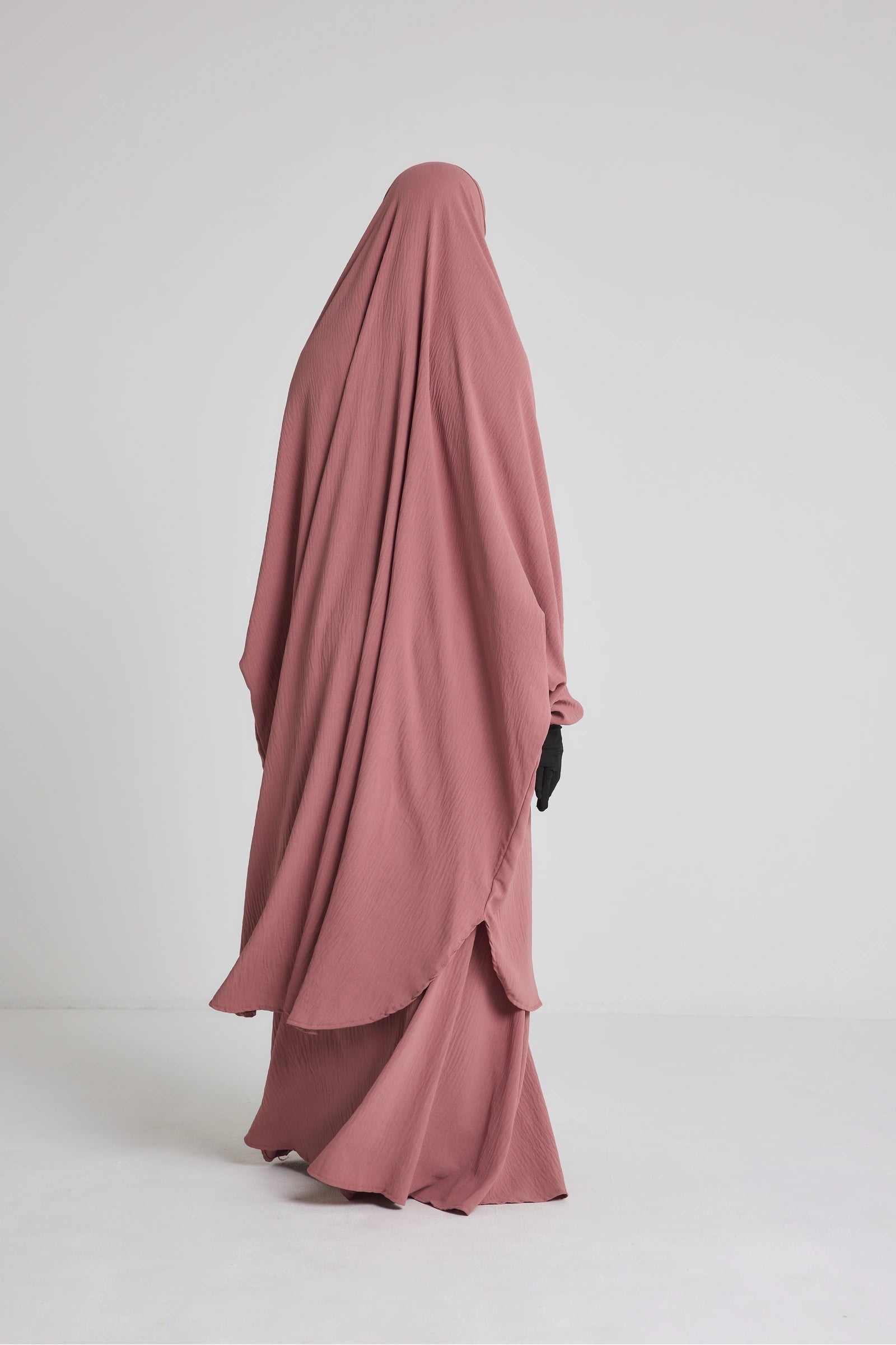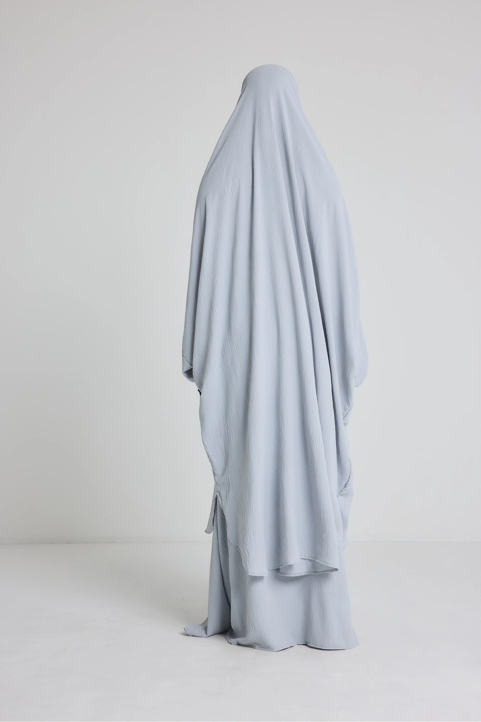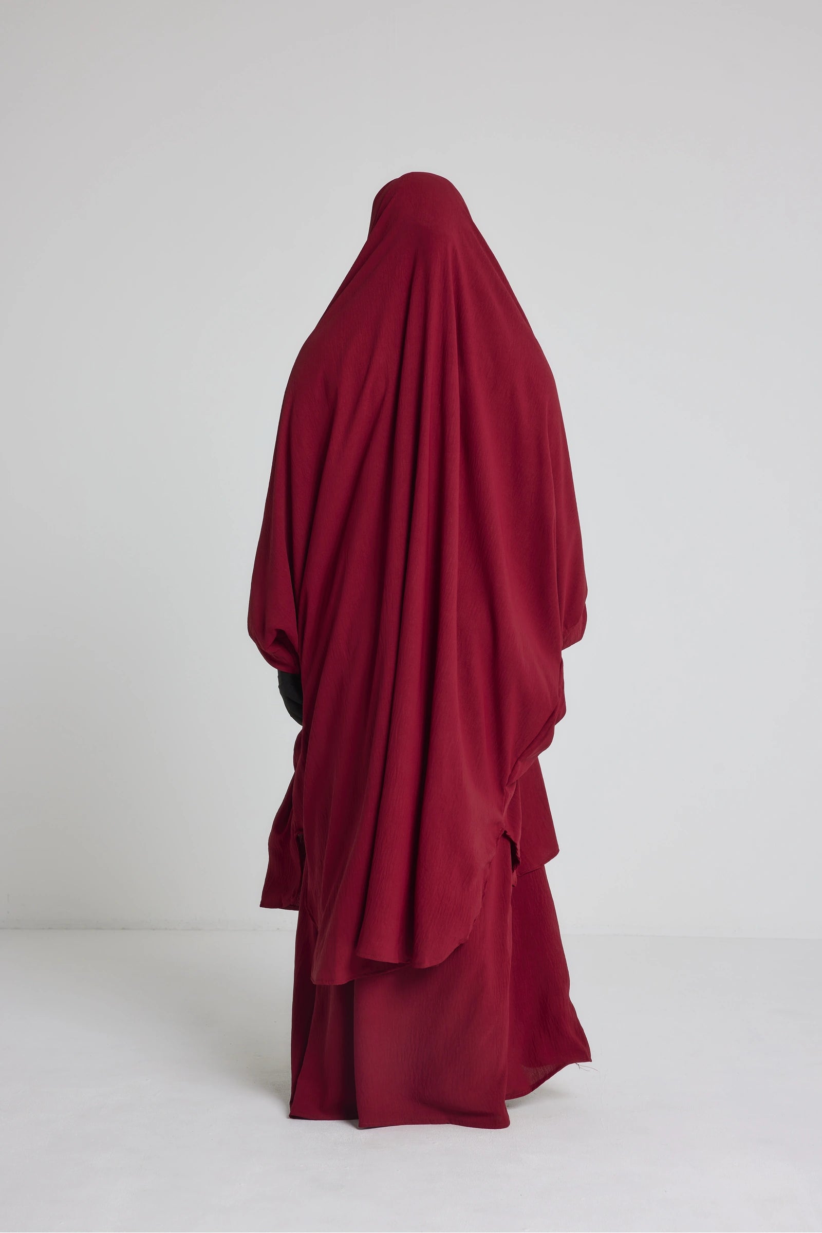 Le haut du jilbeb est ample, avec une coupe étudiée pour couvrir généreusement le buste, les épaules et le haut du dos. Il s’enfile rapidement grâce à l’élastique intégré sous le menton ou au bandeau intégré selon les modèles, et assure une bonne tenue sans glisser. La jupe, large et évasée, est dotée d’une taille élastique qui s’adapte confortablement à toutes les morphologies tout en garantissant un maintien discret.