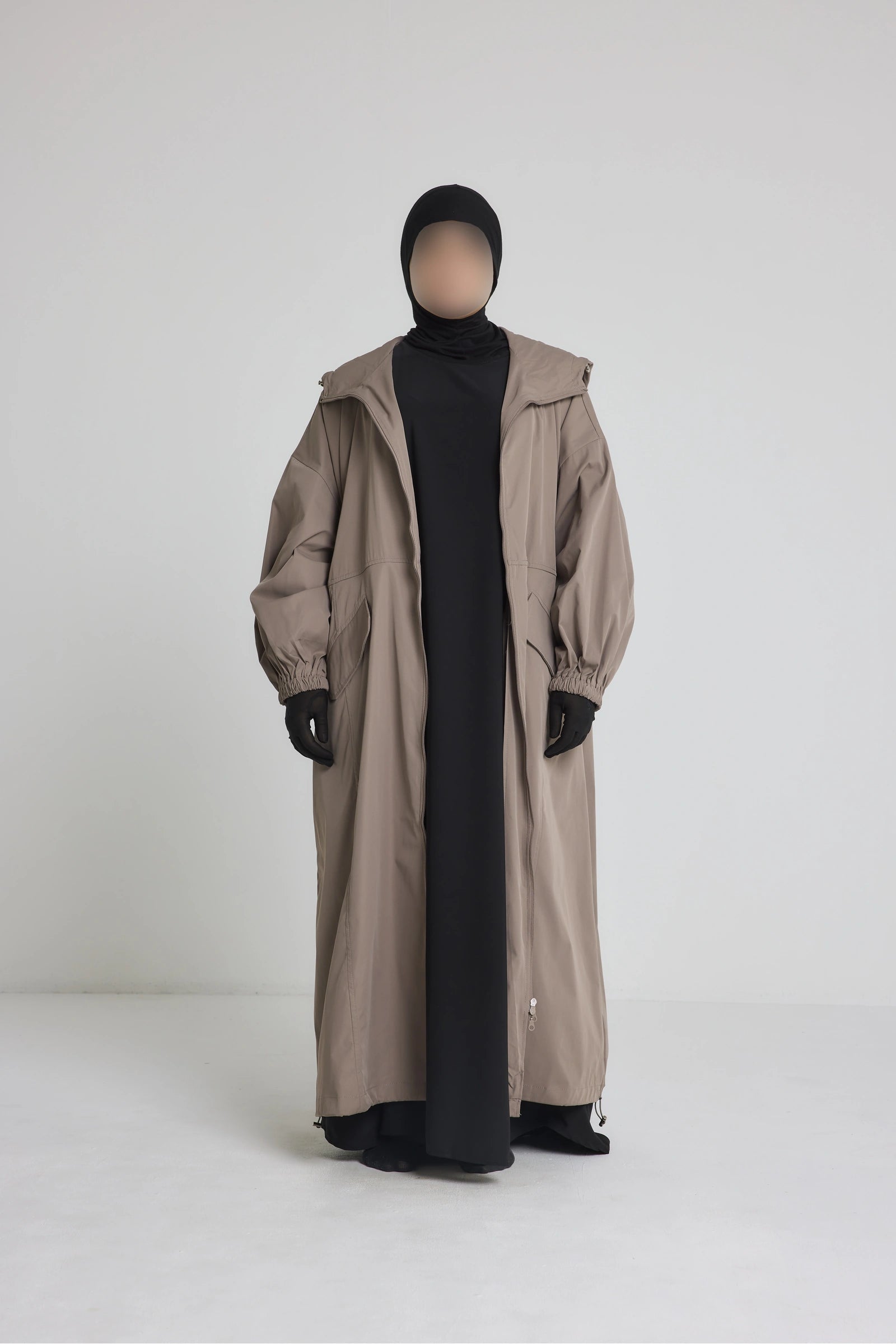 Cet imperméable a longtemps été conçu pour offrir une protection complète tout en conservant une silhouette élégante et discrète. Sa coupe ample et fluide permet de le porter facilement au-dessus d'une abaya ou d'une tenue quotidienne, sans gêne et avec un confort optimal.