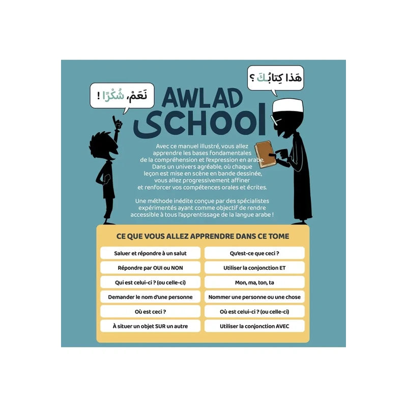 "J'apprends à m'exprimer en langue arabe avec Awlad School (Vol. 1)" est un support d’apprentissage conçu pour répondre aux besoins des débutants, en particulier les non arabophones. Ce livre vous propose un parcours progressif, qui accompagne le lecteur étape par étape dans l’acquisition des bases essentielles de l’expression orale. Le contenu a été pensé pour être à la fois accessible, motivant et rigoureux.