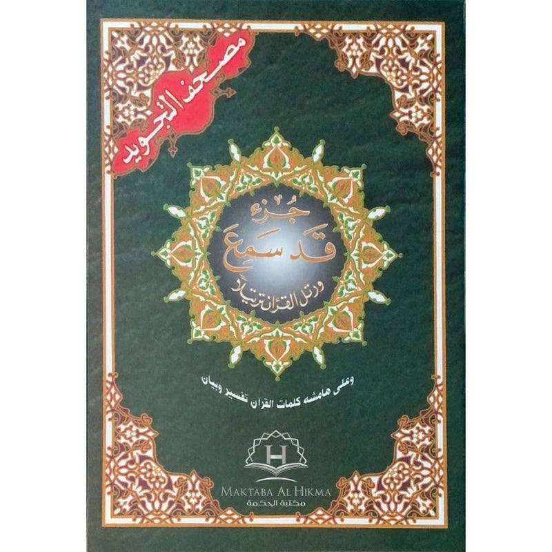 Le Juz’ Qad Sami‘, aussi connu comme les ajzā’ Qad Sami‘ – Tabārak – ʿAmma, est ici présenté selon la lecture Ḥafs ʿan ʿĀṣim, avec l’application des règles de Tajwīd en couleur. Édité par Dar al-Maaref, ce musḥaf souple de 30 pages a été élaboré dans un objectif pédagogique clair : faciliter l’apprentissage et la bonne application des règles de récitation du Coran.