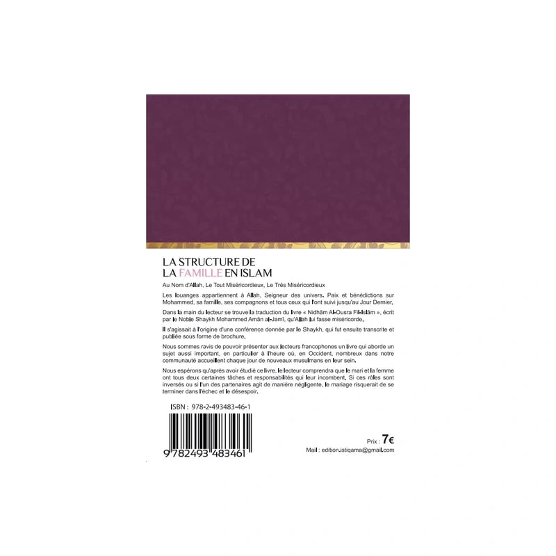 La structure de la famille en islam est la traduction fidèle d’une conférence du Shaykh Mohammed Aman al-Jamî, qu’Allah lui fasse miséricorde, aujourd’hui présentée sous forme de brochure accessible aux lecteurs francophones. Ce texte, à la fois simple et profond, traite d’un pilier fondamental de la société musulmane : la famille. Il s’adresse à tous ceux qui souhaitent comprendre le cadre instauré par l’islam pour préserver l’harmonie et la stabilité au sein du couple et du foyer.
