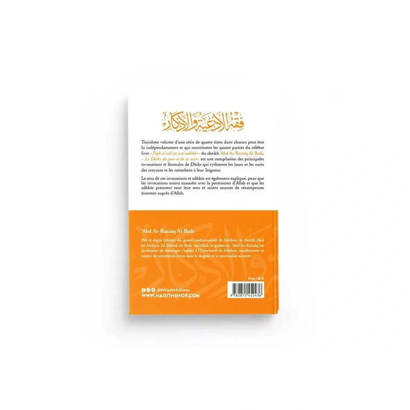 Le Dhikr du jour et de la nuit constitue le troisième volume de la série extraite de l’œuvre Fiqh al-Ad‘iya wal-Adhkâr du Cheikh ‘Abd Ar-Razzâq Al-Badr. Bien qu’il s’inscrive dans une suite cohérente, ce livre peut être lu de manière autonome. Il offre au lecteur une compilation soignée des invocations et formules de rappel à réciter au cours des différentes étapes de la journée et de la nuit, selon la tradition prophétique.