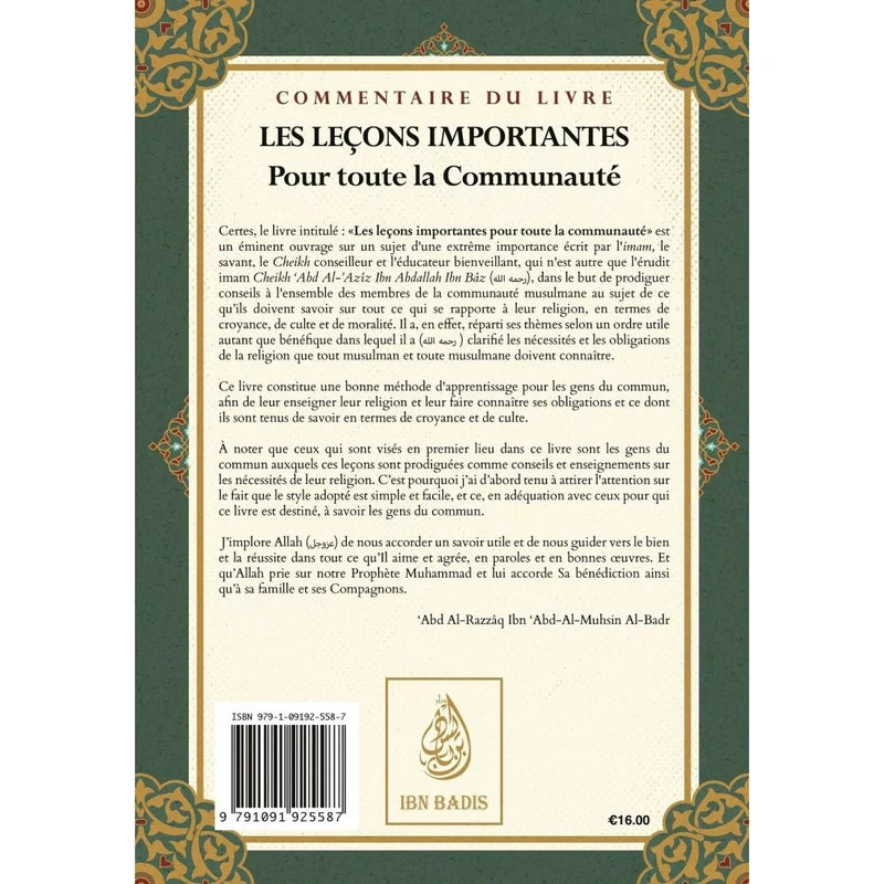 Le livre Les leçons importantes pour toute la communauté, écrit par l’imam Cheikh ‘Abd Al-‘Azîz Ibn Bâz (رحمه الله), est une épître pédagogique d’une grande valeur destinée à initier les musulmans, hommes et femmes, aux fondements essentiels de leur religion. Organisé avec clarté et progressivité, l’ouvrage couvre les notions indispensables de croyance, d’adoration et de comportement que chaque musulman doit maîtriser pour vivre sa foi correctement. L’auteur y expose avec bienveillance les bases de l’islam selon un style simple et accessible, parfaitement adapté aux gens du commun, sans sacrifier pour autant la rigueur scientifique.