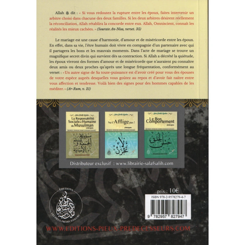 « Les méfaits du divorce » (مخاطر الطلاق) de Muhammad S. Raslan est un ouvrage précieux qui aborde de manière lucide et argumentée les conséquences du divorce dans le cadre du mariage islamique. L’auteur y met en avant l’importance du lien conjugal dans l’islam, en rappelant que le mariage est une institution sacrée destinée à durer, fondée sur l’amour, la miséricorde et le respect mutuel.