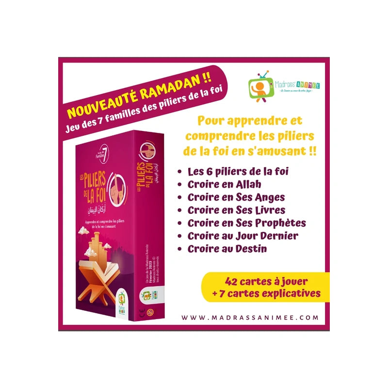 Le Jeu des 7 familles – Les piliers de la foi est un outil éducatif conçu pour enseigner aux enfants les fondements de la croyance islamique de façon divertissante. En reprenant les codes familiers du jeu des 7 familles, il permet une approche simple, ludique et progressive de notions parfois abstraites, en les rendant accessibles dès le plus jeune âge.