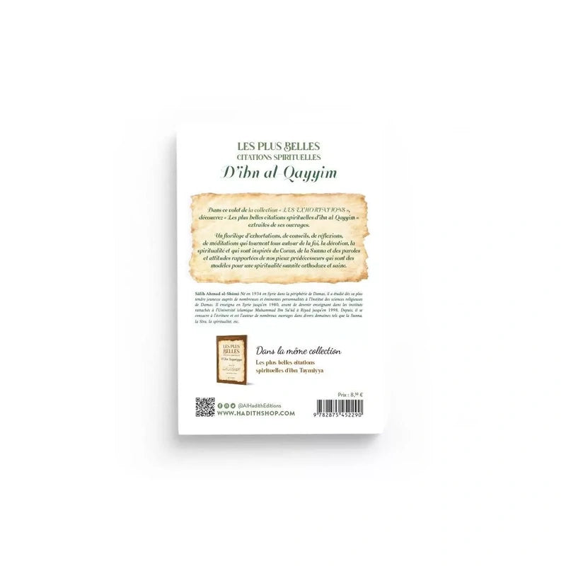 Dans le cadre de la collection Les Exhortations, cet ouvrage met à l’honneur les paroles profondes d’Ibn al-Qayyim, grand savant et maître en spiritualité sunnite. Le lecteur y trouvera un ensemble d’extraits choisis, tirés de ses écrits les plus influents, offrant un regard pénétrant sur la foi, la relation à Allah, la purification de l’âme et le cheminement intérieur. Chaque citation agit comme un rappel puissant et bienveillant, enraciné dans les sources authentiques de l’islam.