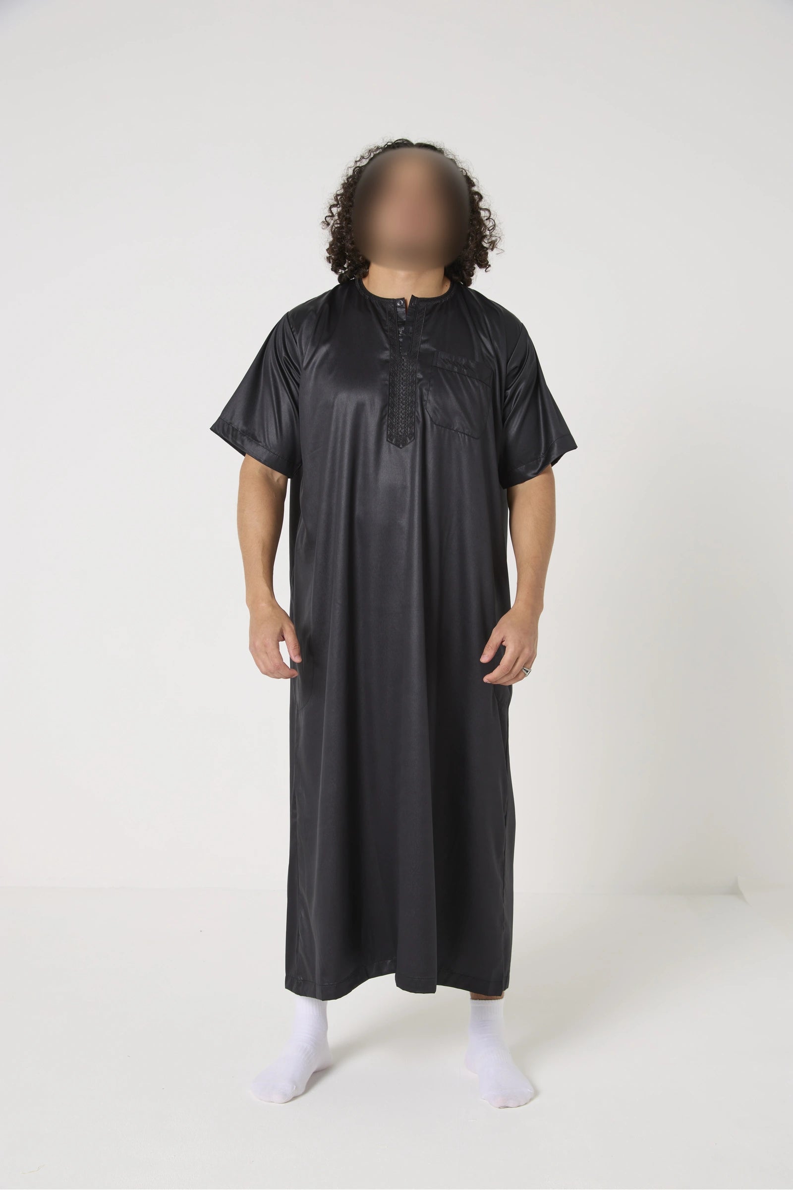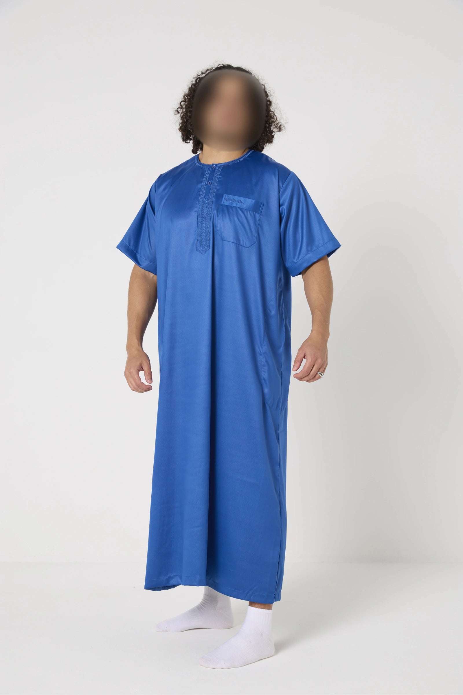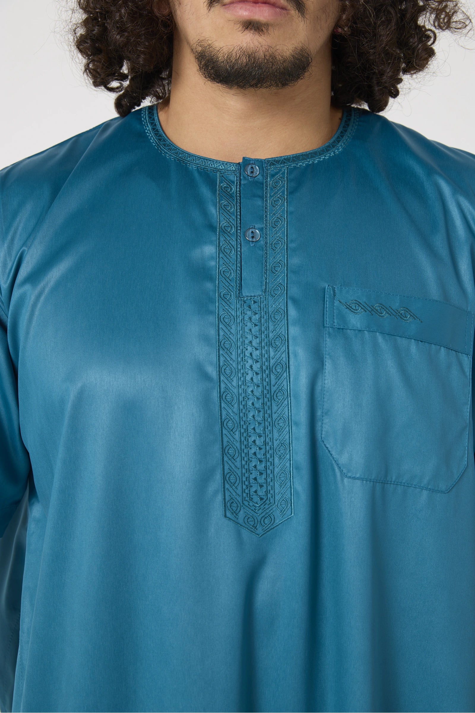 Le qamis Atlas manches courtes est une tenue incontournable qui conjugue confort et élégance. Son tissu satiné fluide reflète une belle lumière tout en restant discret, et sa coupe droite offre une grande aisance de mouvement. Les manches courtes en font un choix idéal pour les journées estivales ou les climats chauds, sans compromis sur le raffinement. Le col rond boutonné et les fines broderies sur la poitrine apportent une finition nette et soignée.