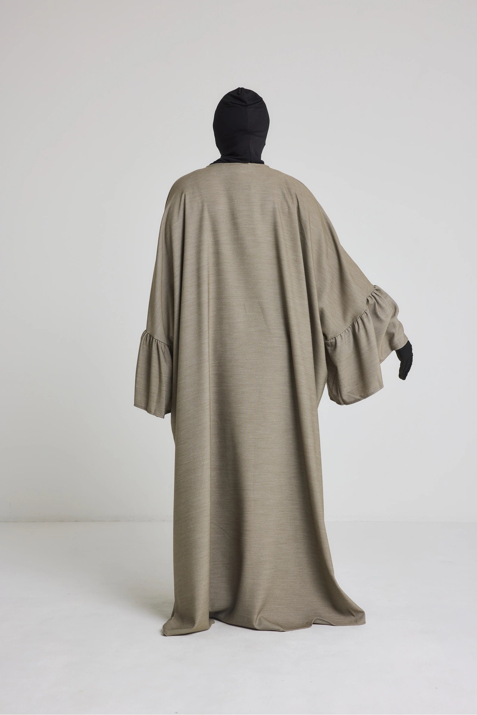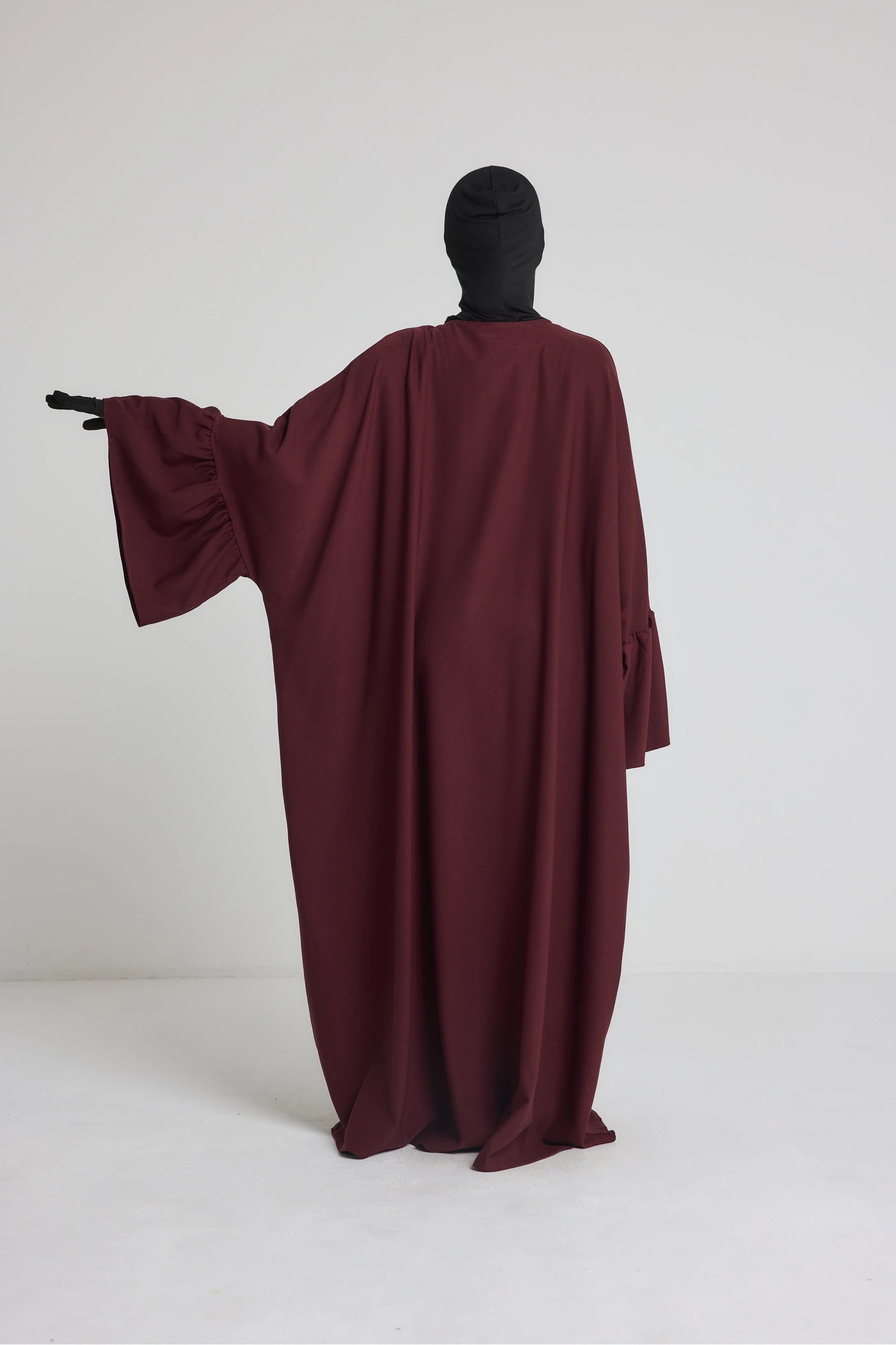 Cette robe abaya se distingue par sa coupe très ample (style farasha) qui offre une couvrance totale et ne marque pas les formes. Elle est dotée d'une fermeture zippée discrète au niveau du buste, idéale pour faciliter l'habillage ou l'allaitement. Les manches apportent tout le caractère à la pièce : larges à l'épaule, elles sont froncées et resserrées aux poignets pour un effet bouffant élégant et pratique. Confectionnée dans un tissu fluide et opaque au retombé lourd.