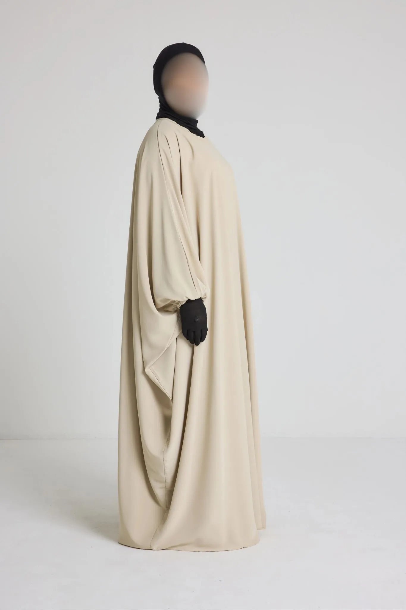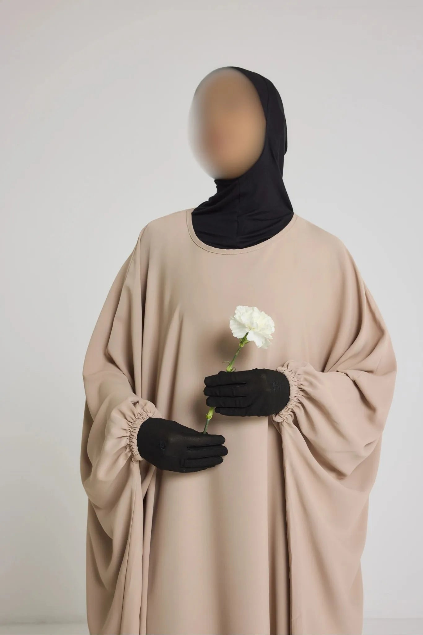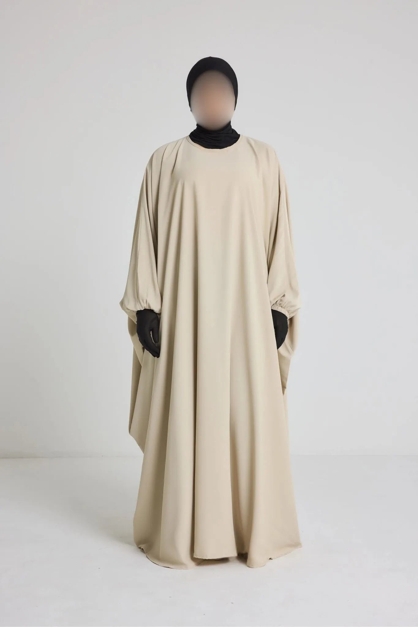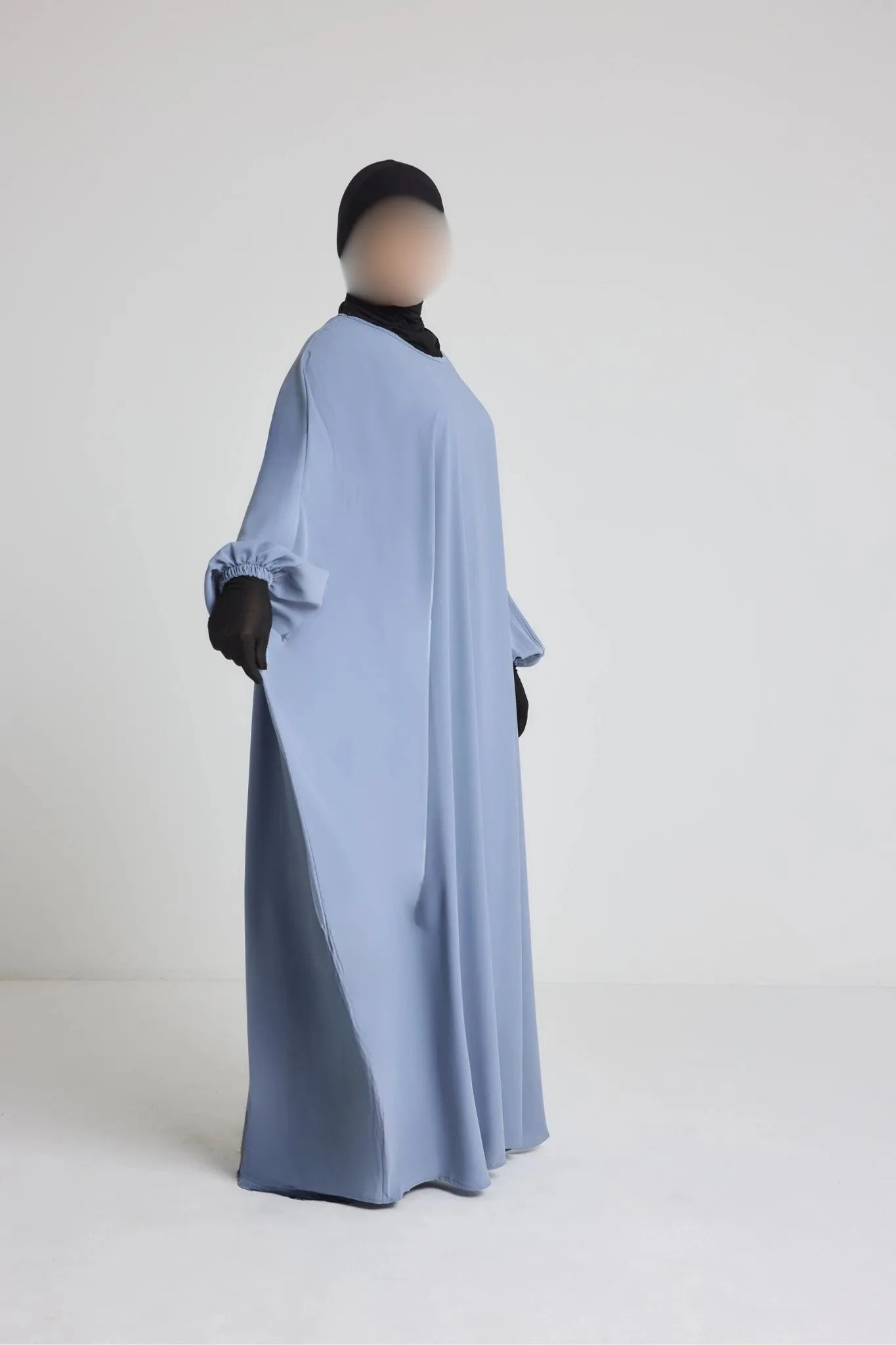 Les manches larges apportent un confort supplémentaire au niveau des bras, tandis que les poignets resserrés maintiennent la tenue avec finesse et élégance. Ce détail crée un joli contraste dans la coupe, tout en offrant un maintien optimal sans gêne. La robe Syhem peut être portée telle quelle ou accompagnée d’un khimar ou d’un jilbeb pour une tenue complète et harmonieuse.