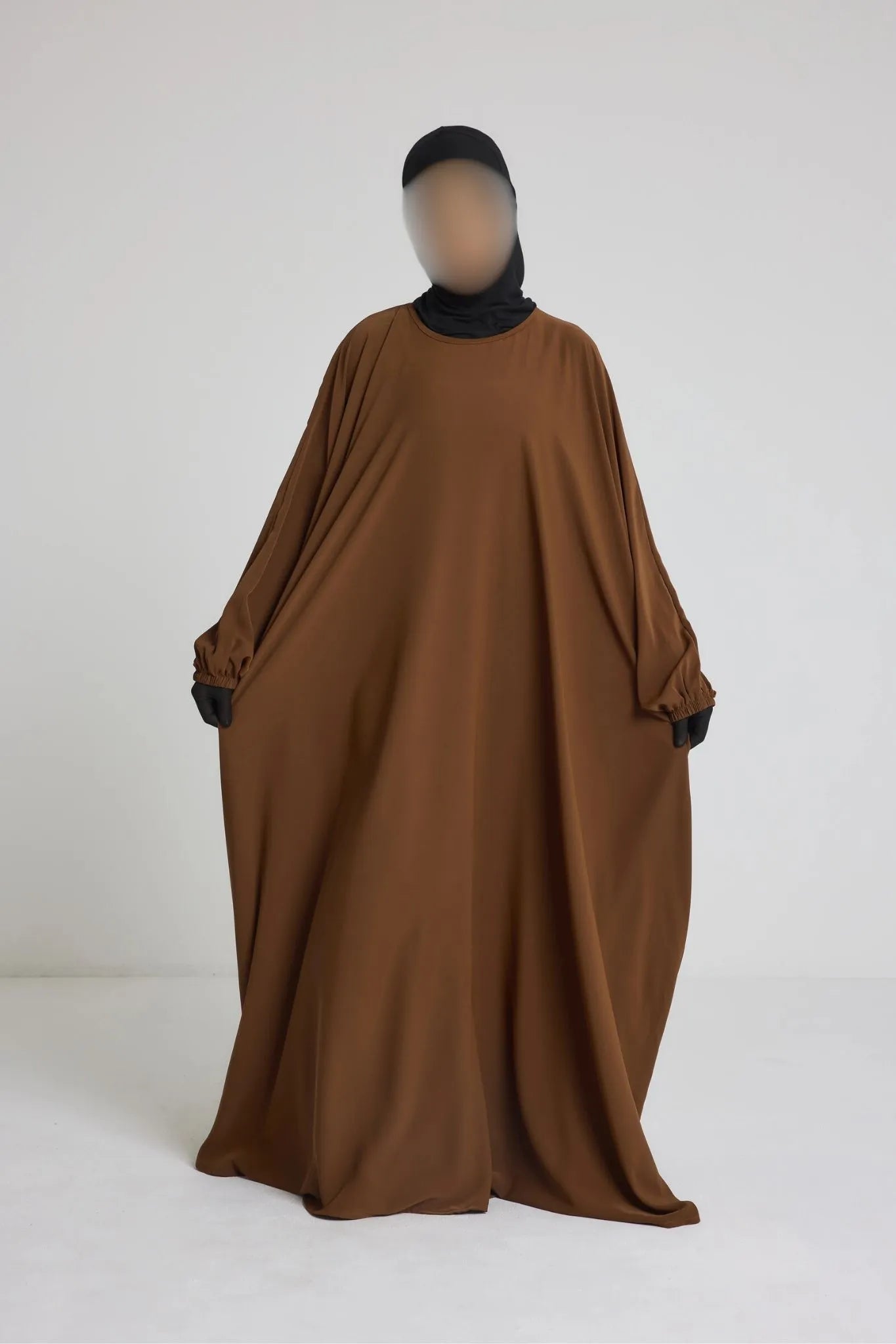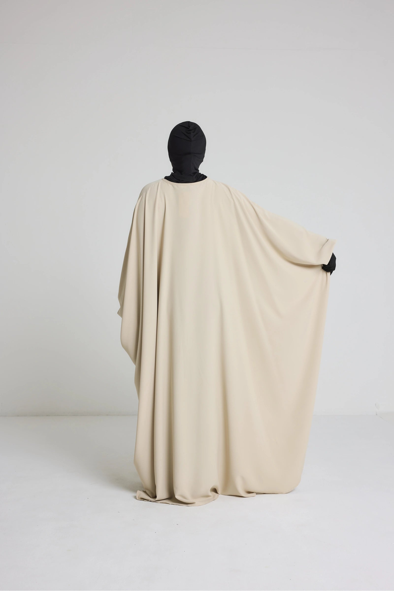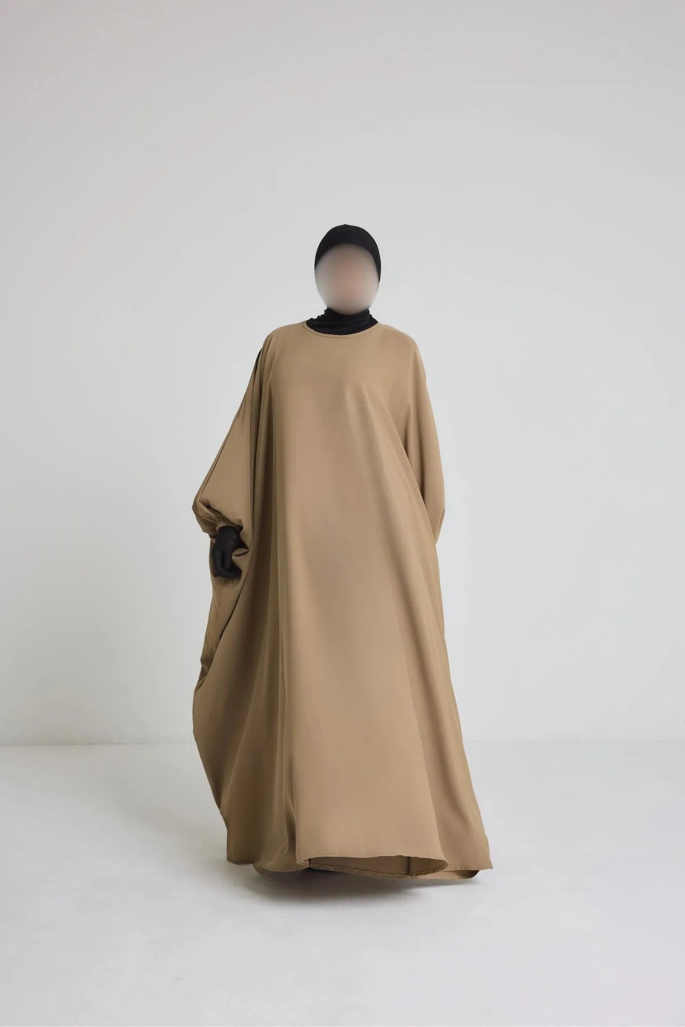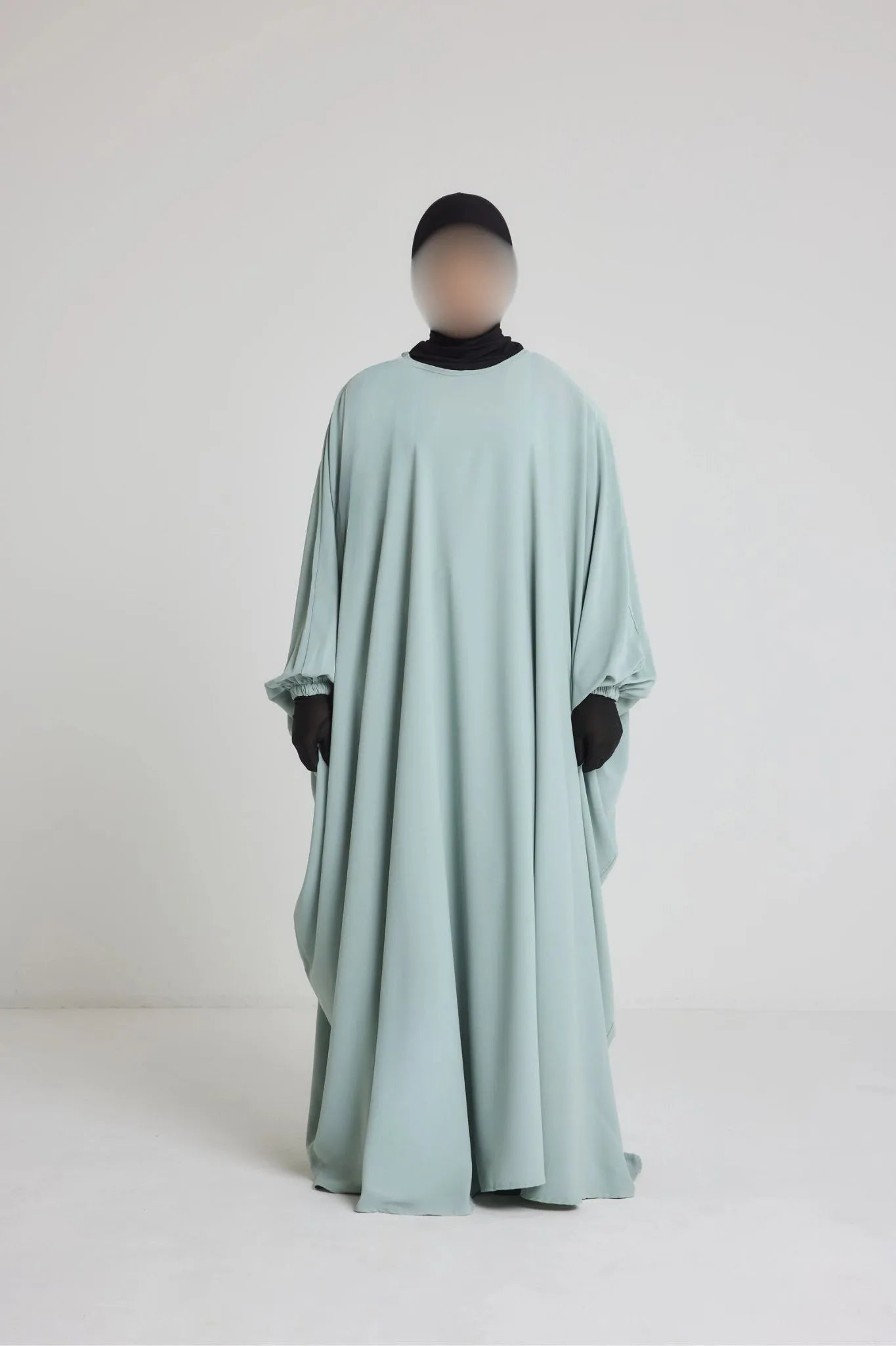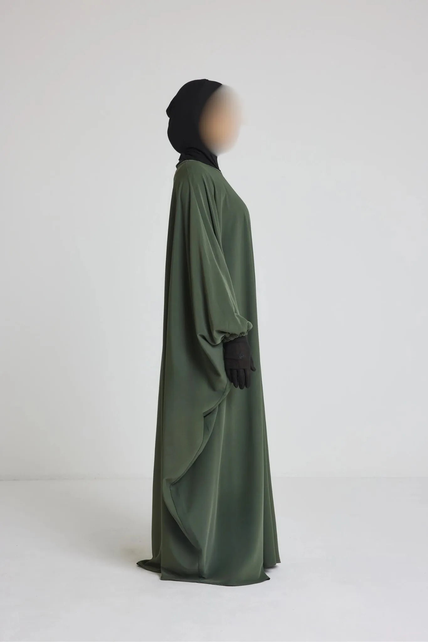 Les manches larges apportent un confort supplémentaire au niveau des bras, tandis que les poignets resserrés maintiennent la tenue avec finesse et élégance. Ce détail crée un joli contraste dans la coupe, tout en offrant un maintien optimal sans gêne. La robe Syhem peut être portée telle quelle ou accompagnée d’un khimar ou d’un jilbeb pour une tenue complète et harmonieuse.