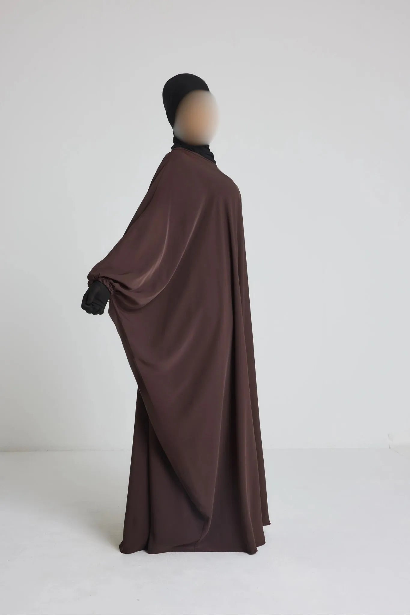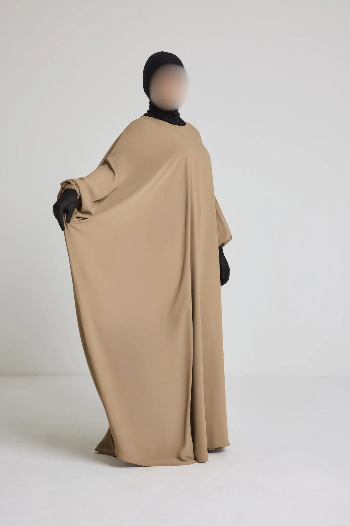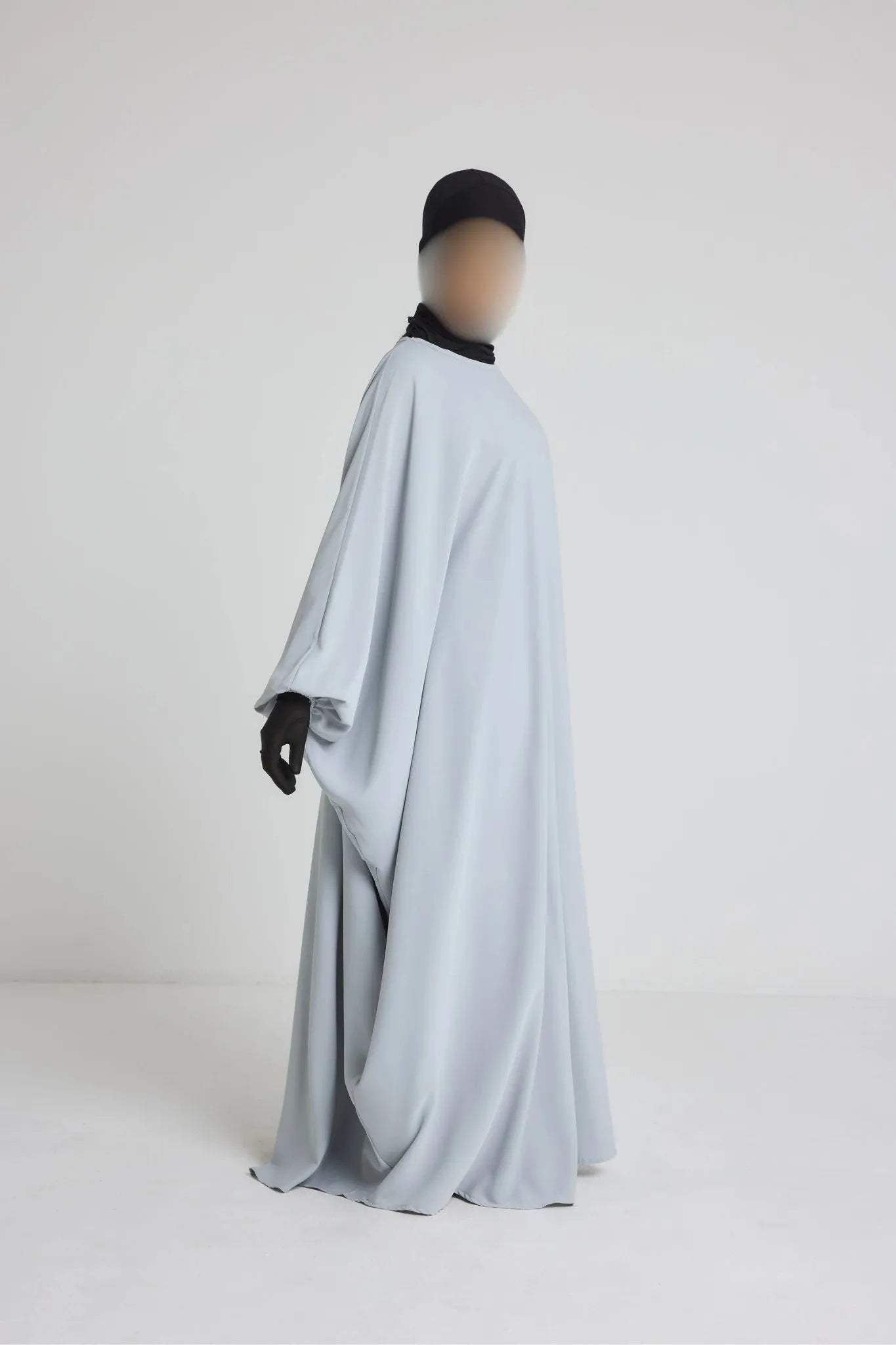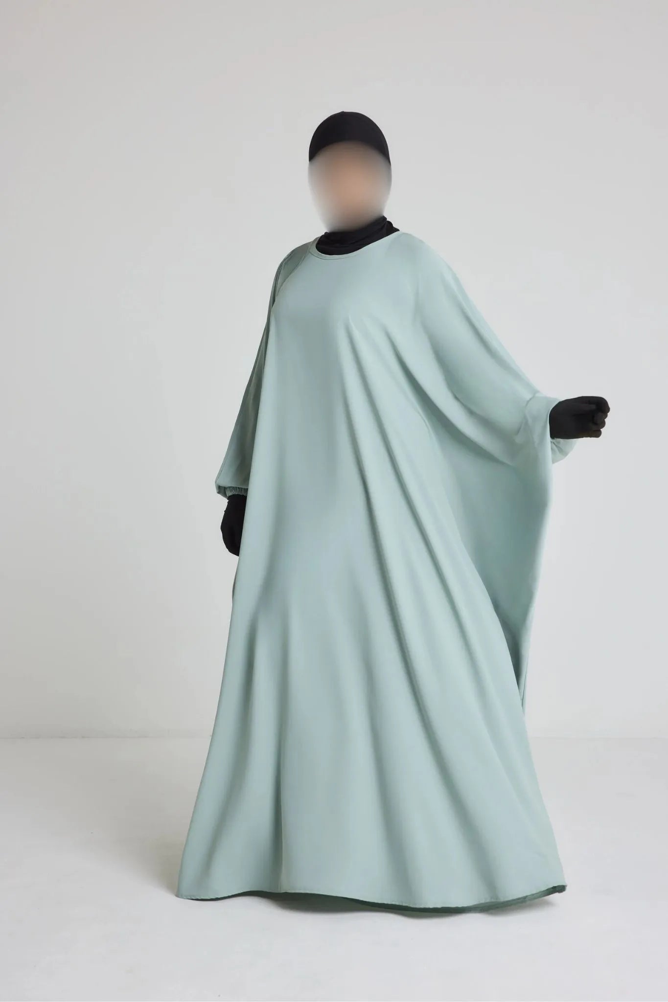 Les manches larges apportent un confort supplémentaire au niveau des bras, tandis que les poignets resserrés maintiennent la tenue avec finesse et élégance. Ce détail crée un joli contraste dans la coupe, tout en offrant un maintien optimal sans gêne. La robe Syhem peut être portée telle quelle ou accompagnée d’un khimar ou d’un jilbeb pour une tenue complète et harmonieuse.