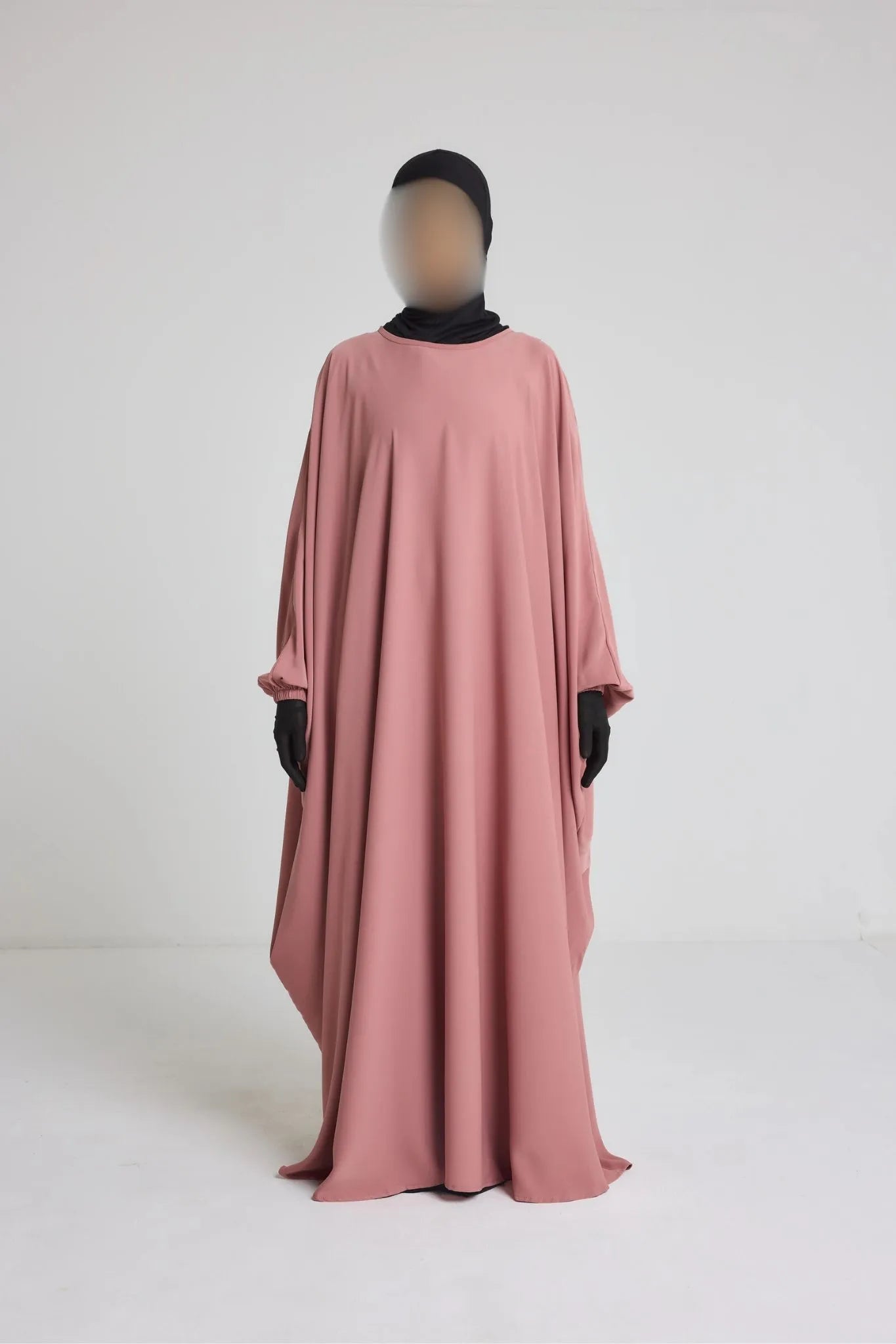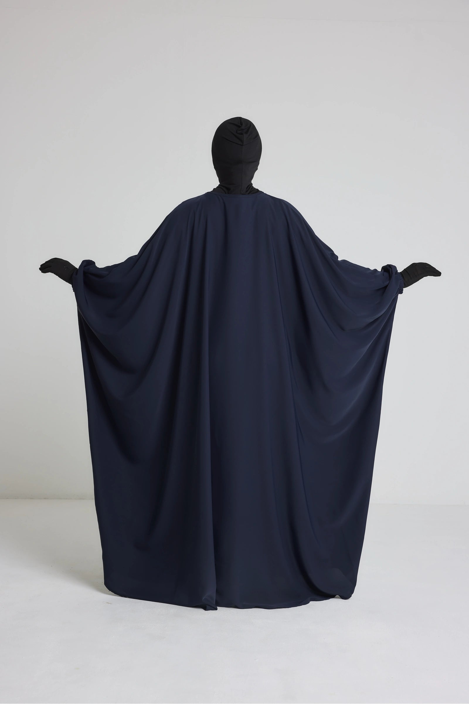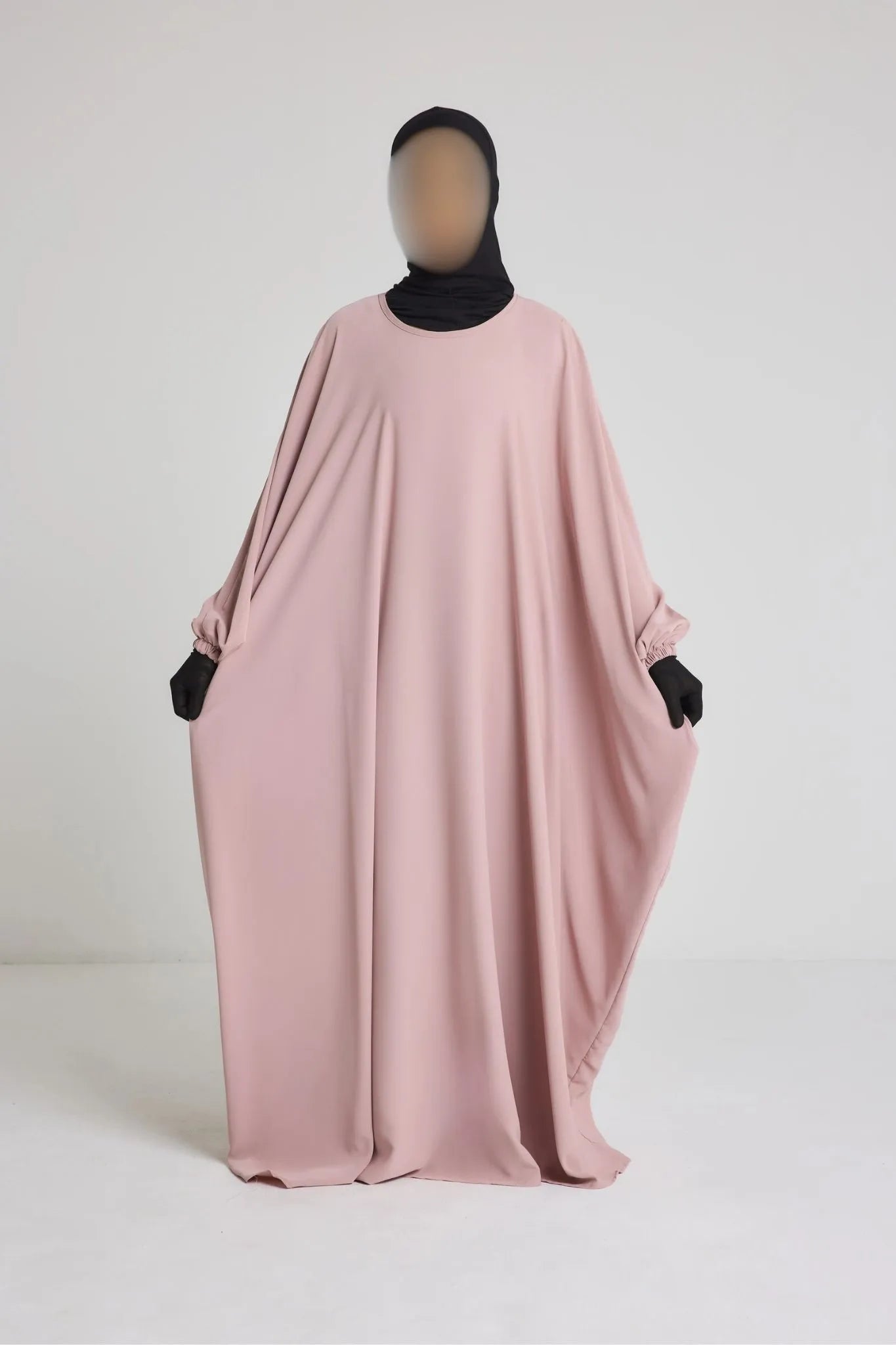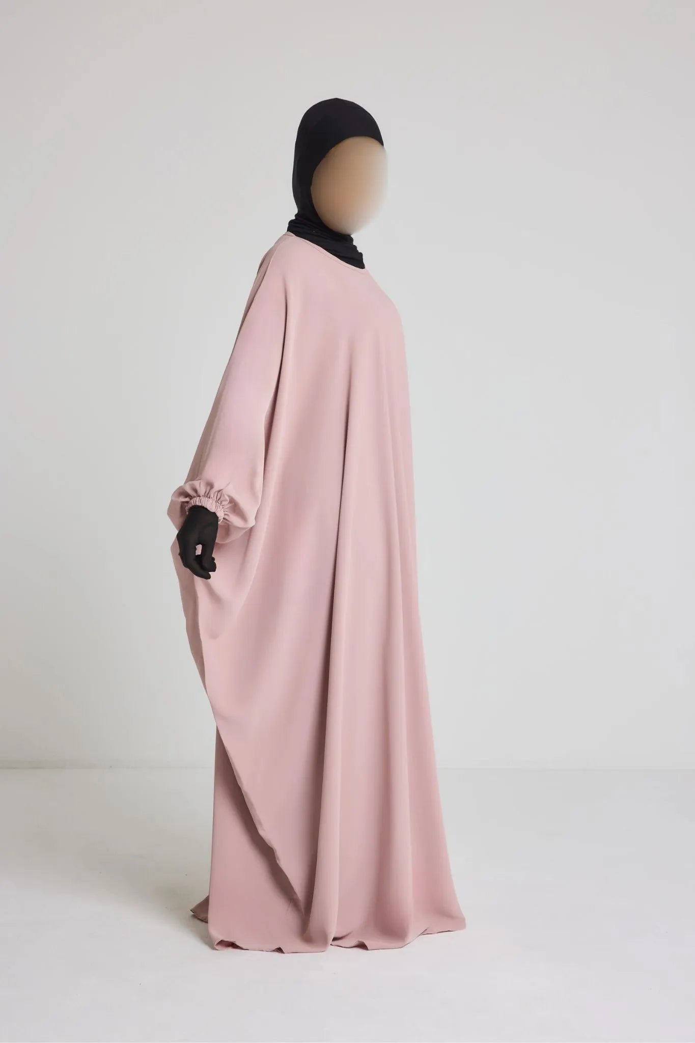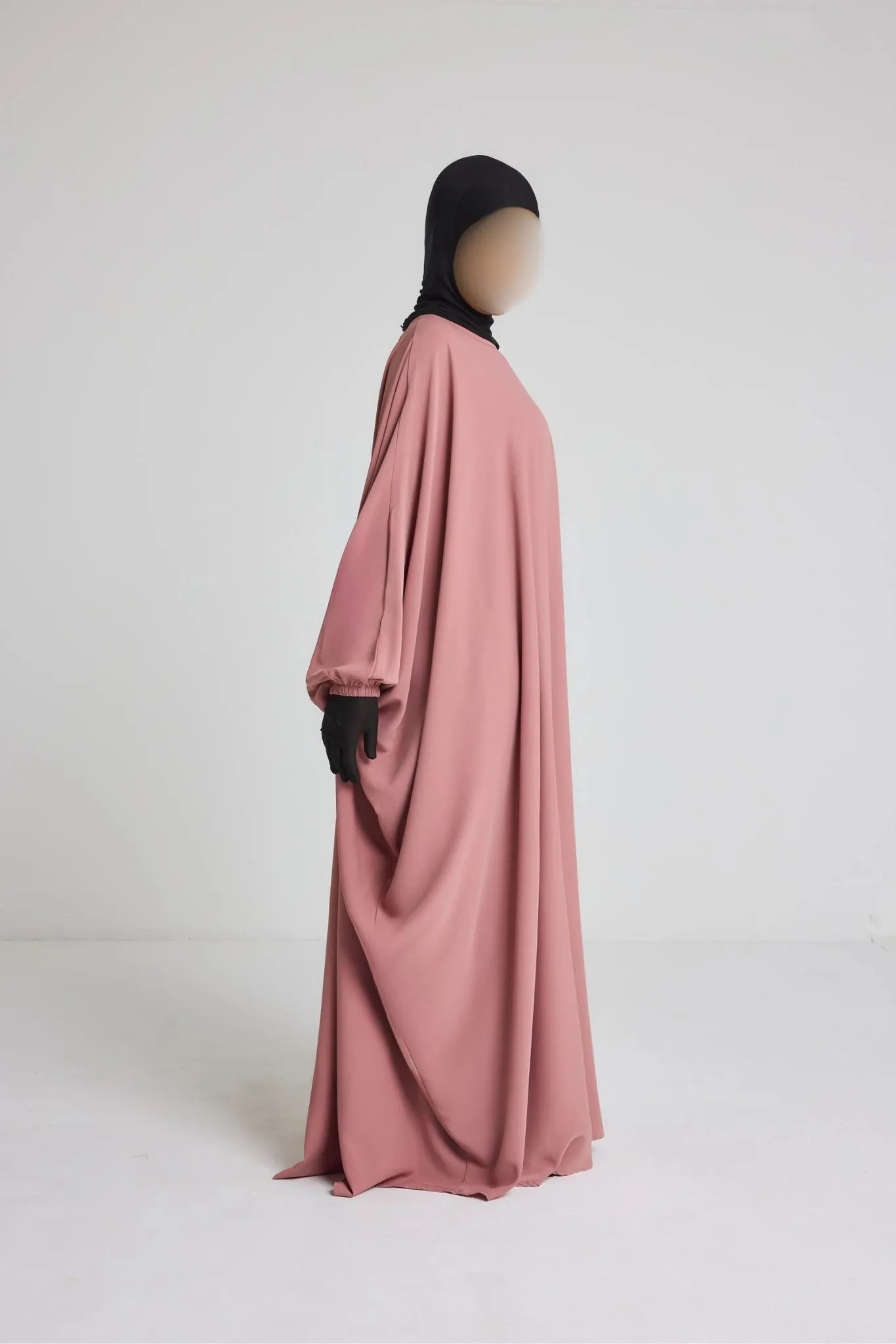 Les manches larges apportent un confort supplémentaire au niveau des bras, tandis que les poignets resserrés maintiennent la tenue avec finesse et élégance. Ce détail crée un joli contraste dans la coupe, tout en offrant un maintien optimal sans gêne. La robe Syhem peut être portée telle quelle ou accompagnée d’un khimar ou d’un jilbeb pour une tenue complète et harmonieuse.