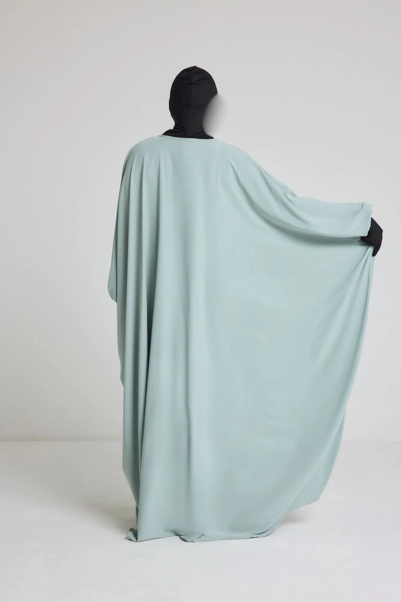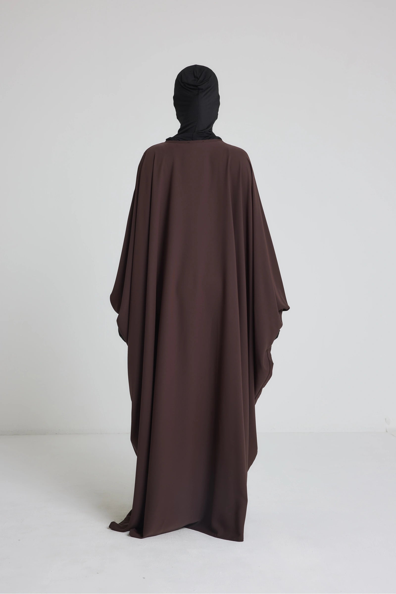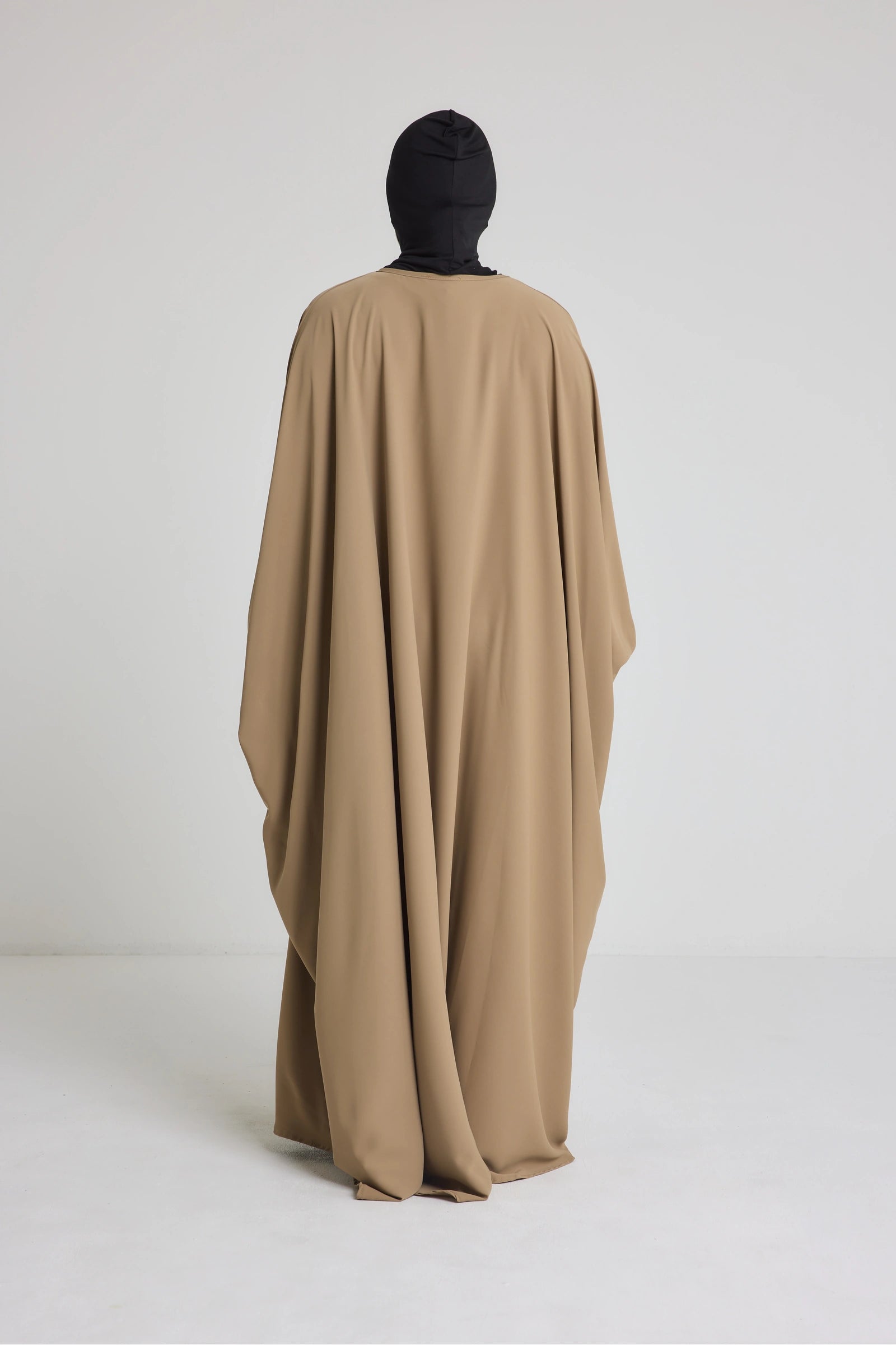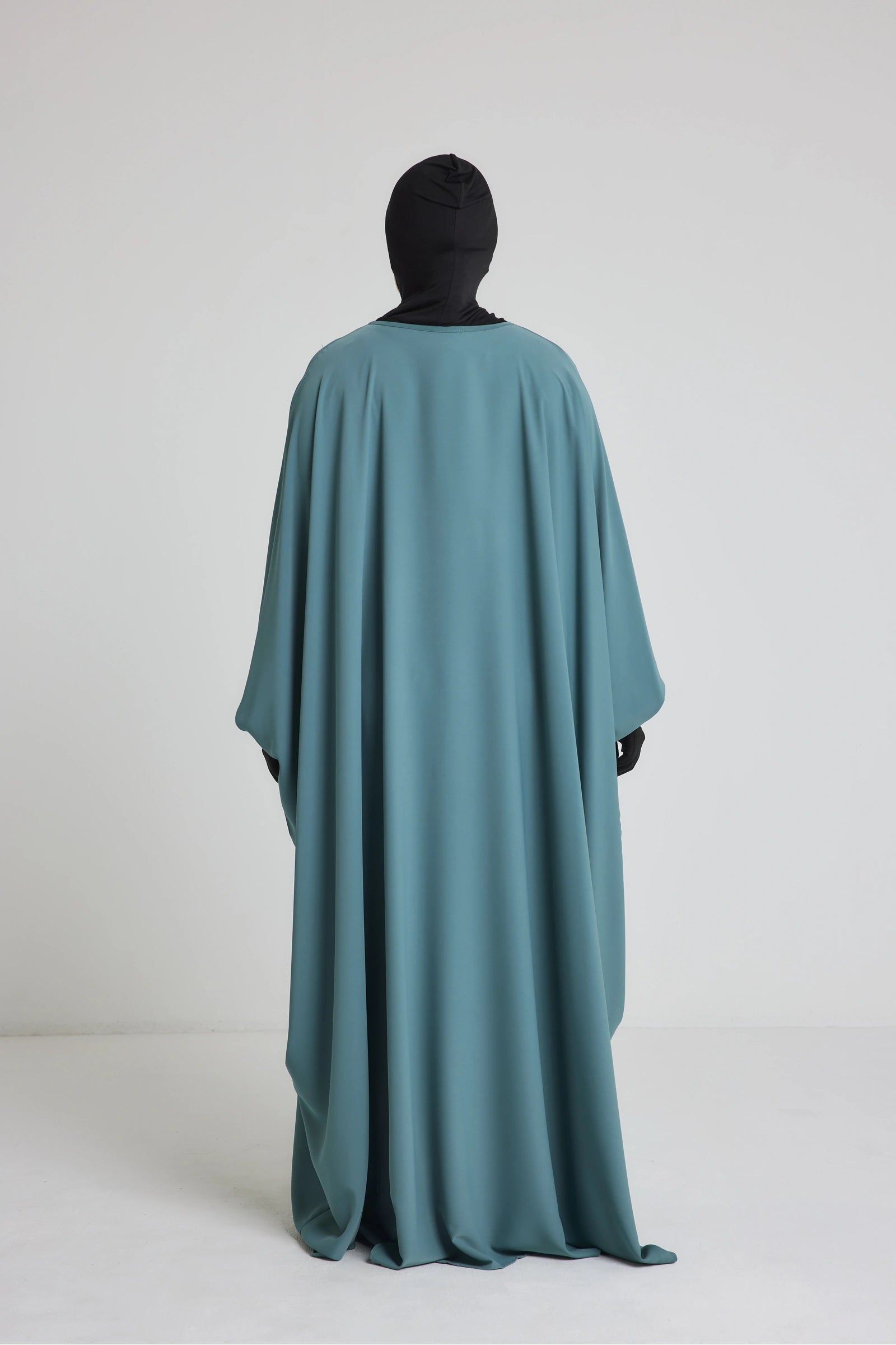Les manches larges apportent un confort supplémentaire au niveau des bras, tandis que les poignets resserrés maintiennent la tenue avec finesse et élégance. Ce détail crée un joli contraste dans la coupe, tout en offrant un maintien optimal sans gêne. La robe Syhem peut être portée telle quelle ou accompagnée d’un khimar ou d’un jilbeb pour une tenue complète et harmonieuse.