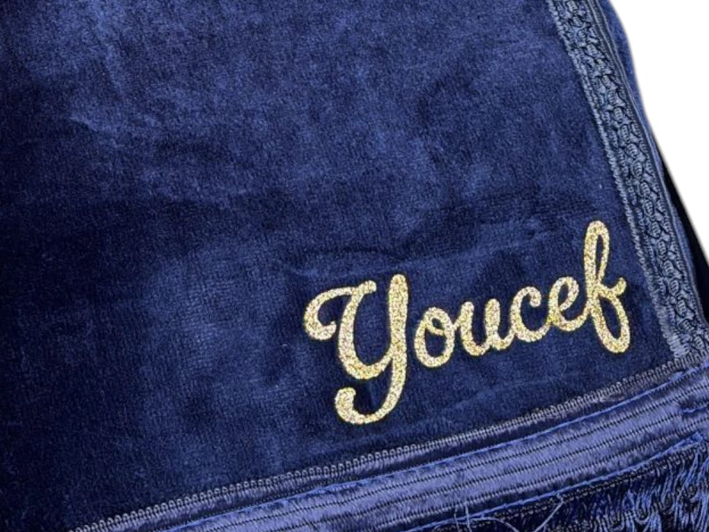 Offrez-vous ou offrez à vos proches un tapis de prière en velours premium, sublimé par une broderie dorée de votre prénom en lettres francaises ou arabes. Confectionné avec soin dans un velours haute densité d'une douceur incomparable, ce tapis allie confort, élégance et spiritualité.